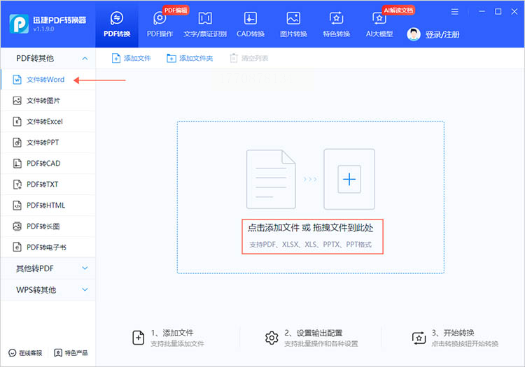 1. 打开软件后,在首页导航中找到“文件转Word”图标,点击进入功能页。通过“添加文件”或拖拽方式上传PDF文档。