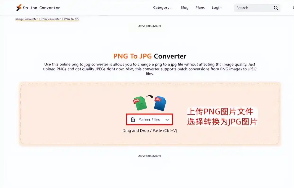 第一步,访问它的网站,点击上传按钮,把本地的PNG图片传上去。在格式选择那里,指定输出为JPG。