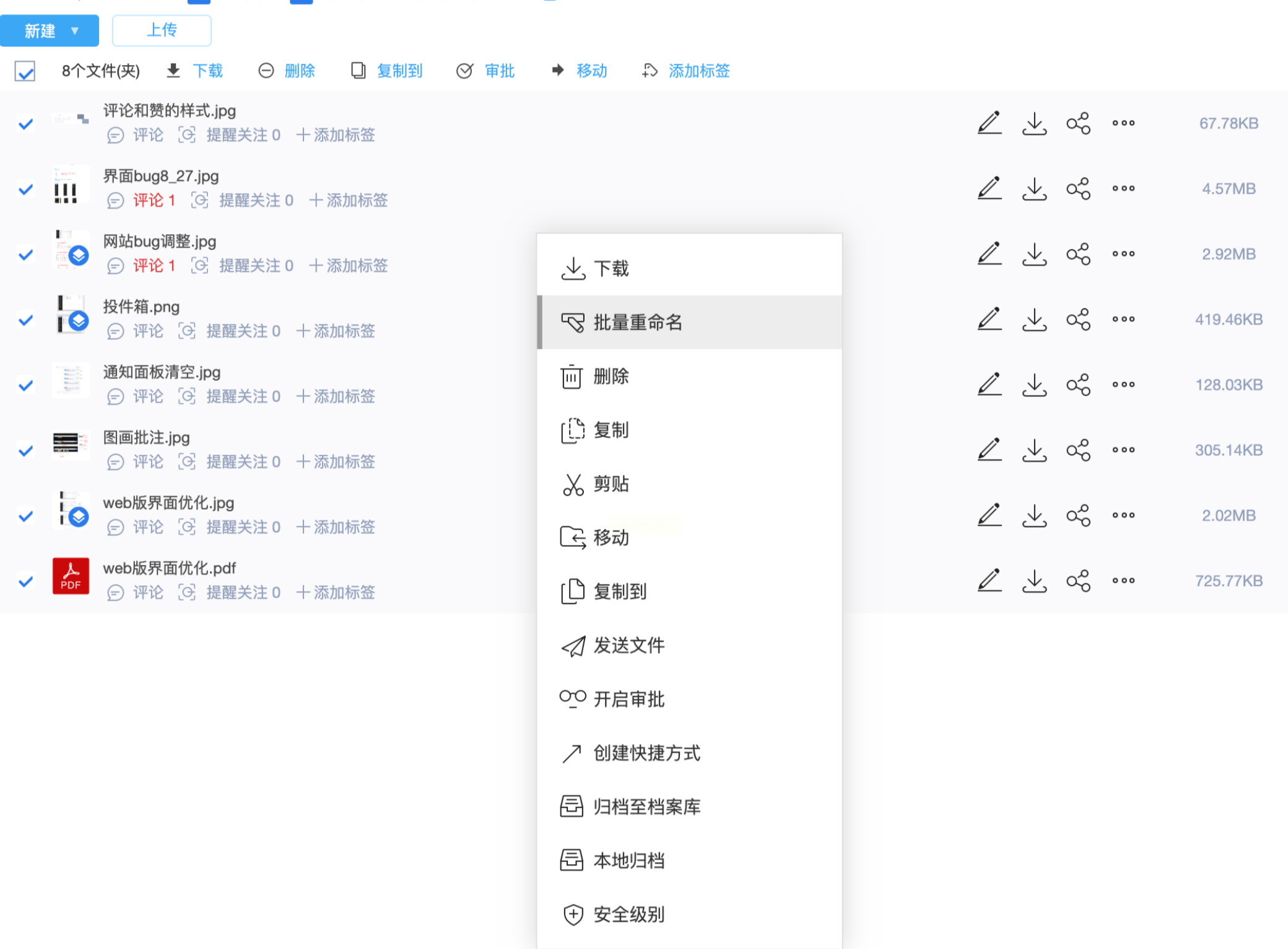 2. 启动批量重命名:选中文件后点击鼠标右键,在弹出菜单中选择"批量重命名"。该功能在企业网盘环境下无需额外安装软件,直接通过网页操作。