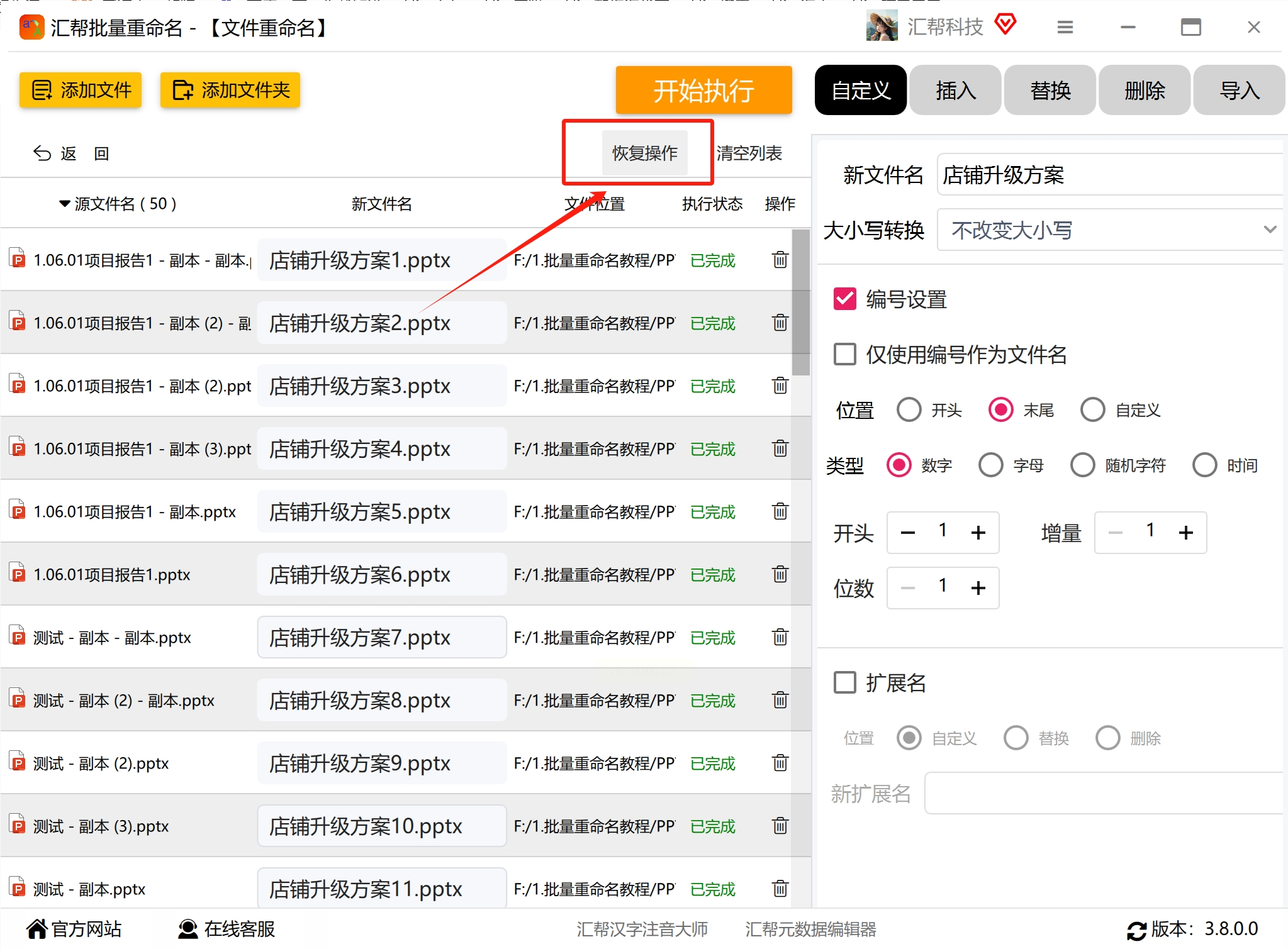 6. 恢复与验证:若操作失误,可点击"恢复操作"按钮一键撤销重命名。建议重命名后打开目标文件夹验证结果,确保所有PPT文件名符合规范。