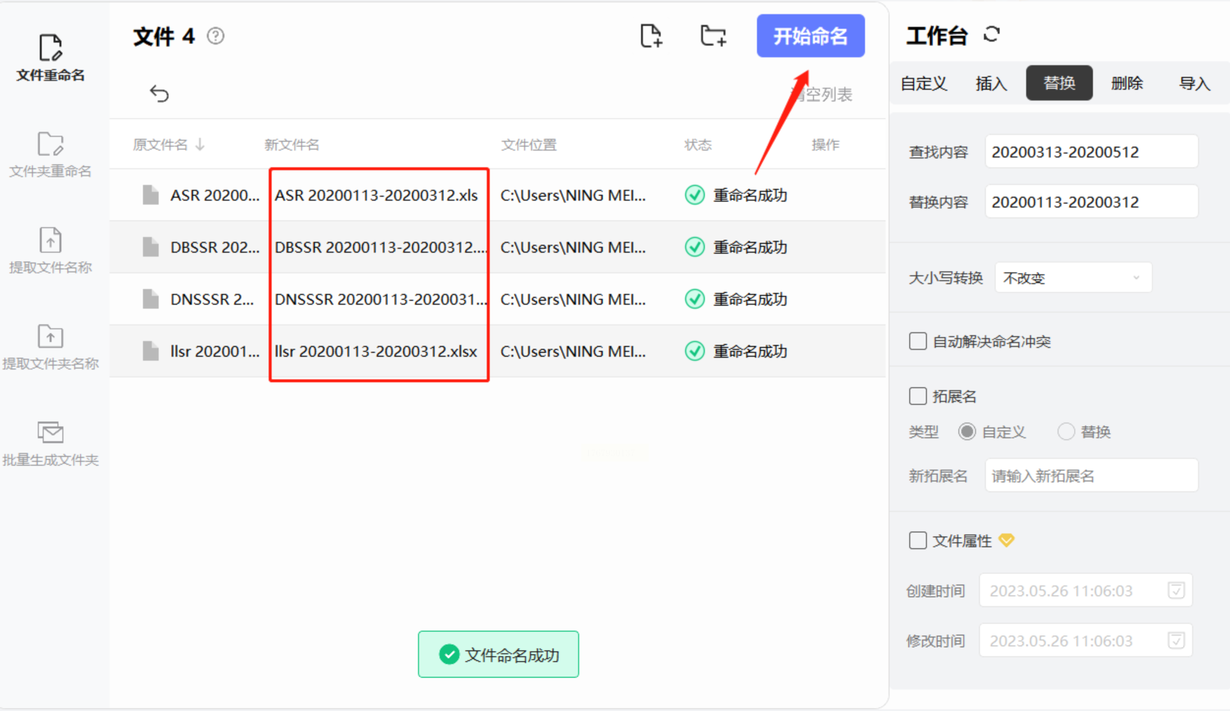 3. 预览与执行:点击"预览"按钮查看替换效果,确认无误后点击"开始重命名"。软件会显示操作进度条,完成后弹出成功提示。