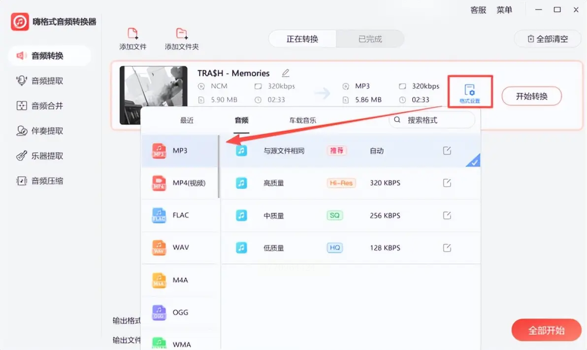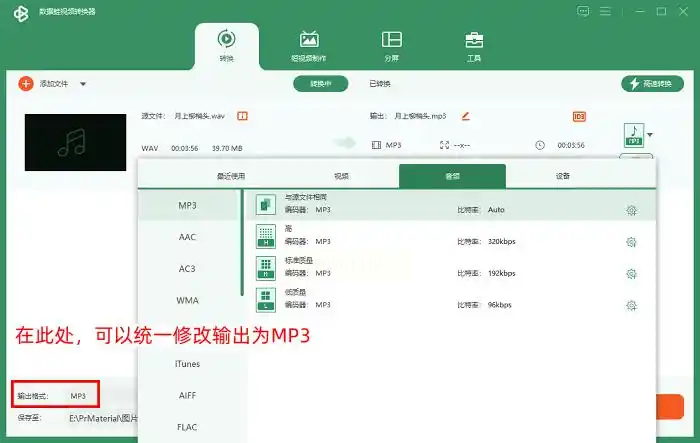 点击“格式设置”按钮,在弹出的窗口中选择“MP3”,同时可根据需求调整比特率(如手机端建议128kbps,保留较好音质的话可选192kbps)。若需批量转换,勾选“批量处理”选项即可。