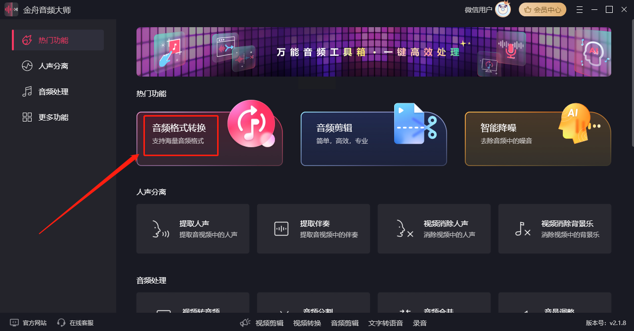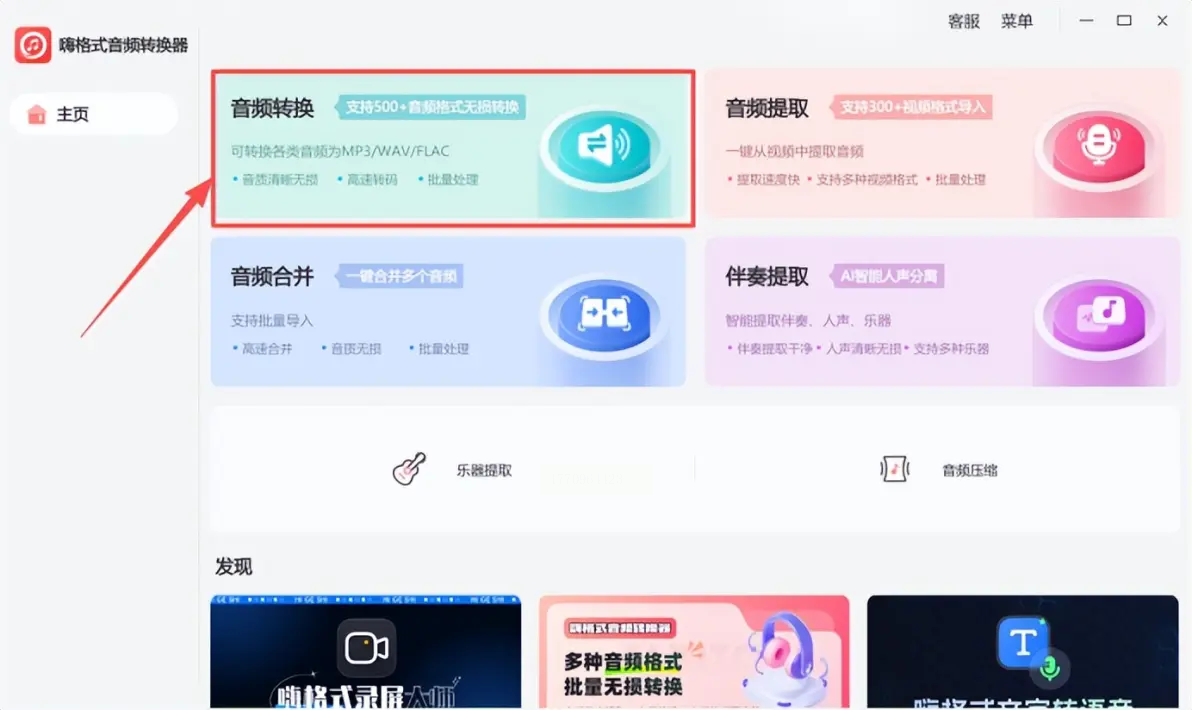 步骤一:安装完成后打开软件,在首页选择“音频格式转换”功能。
