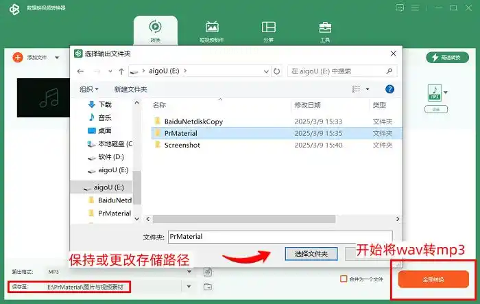 在“文件存放位置”区域,可自定义创建新文件夹保存转换后的MP3文件,也可直接使用软件默认的“音频转换”文件夹,方便后续查找。