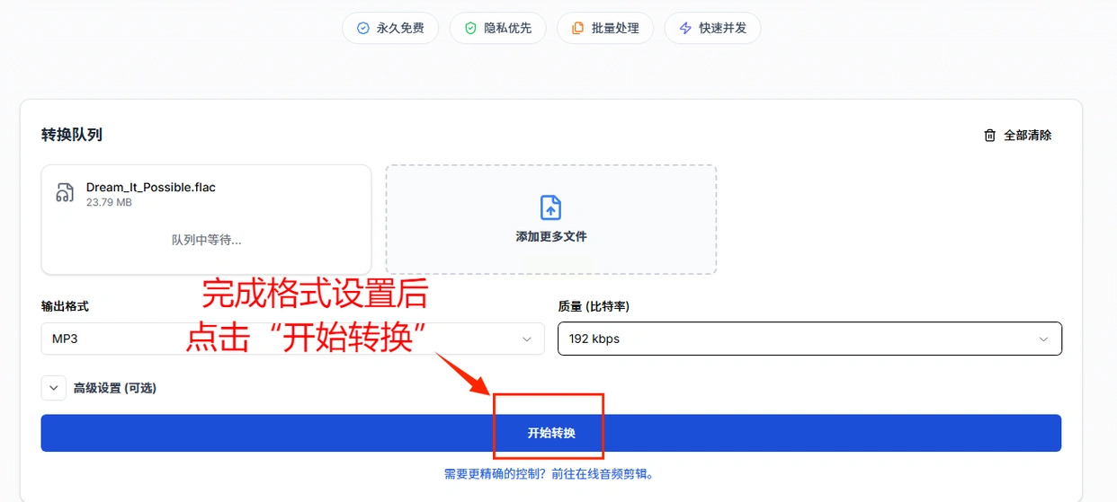 3. 选择参数:确认输出格式为MP3,注意文件大小限制(单文件≤1GB)。