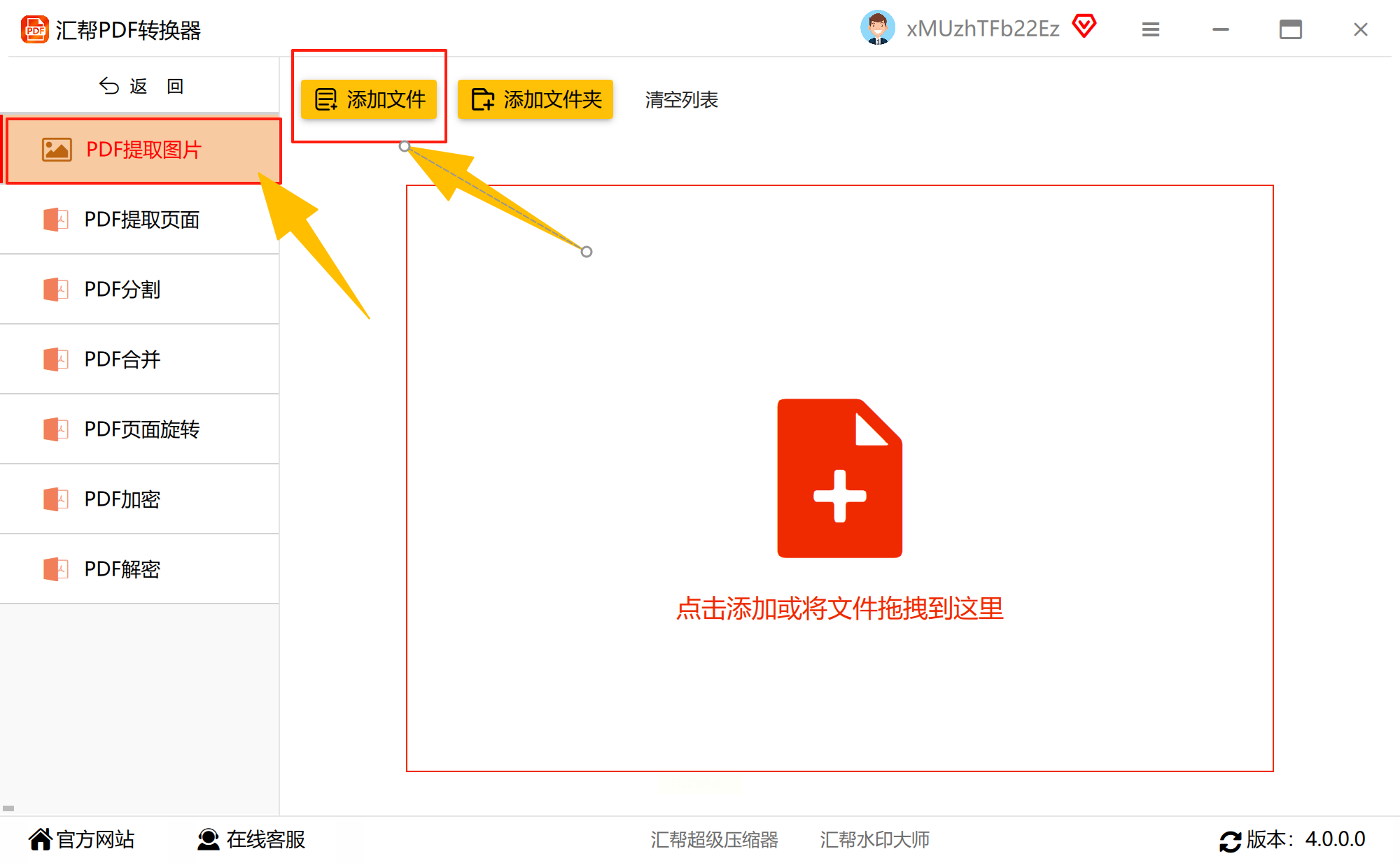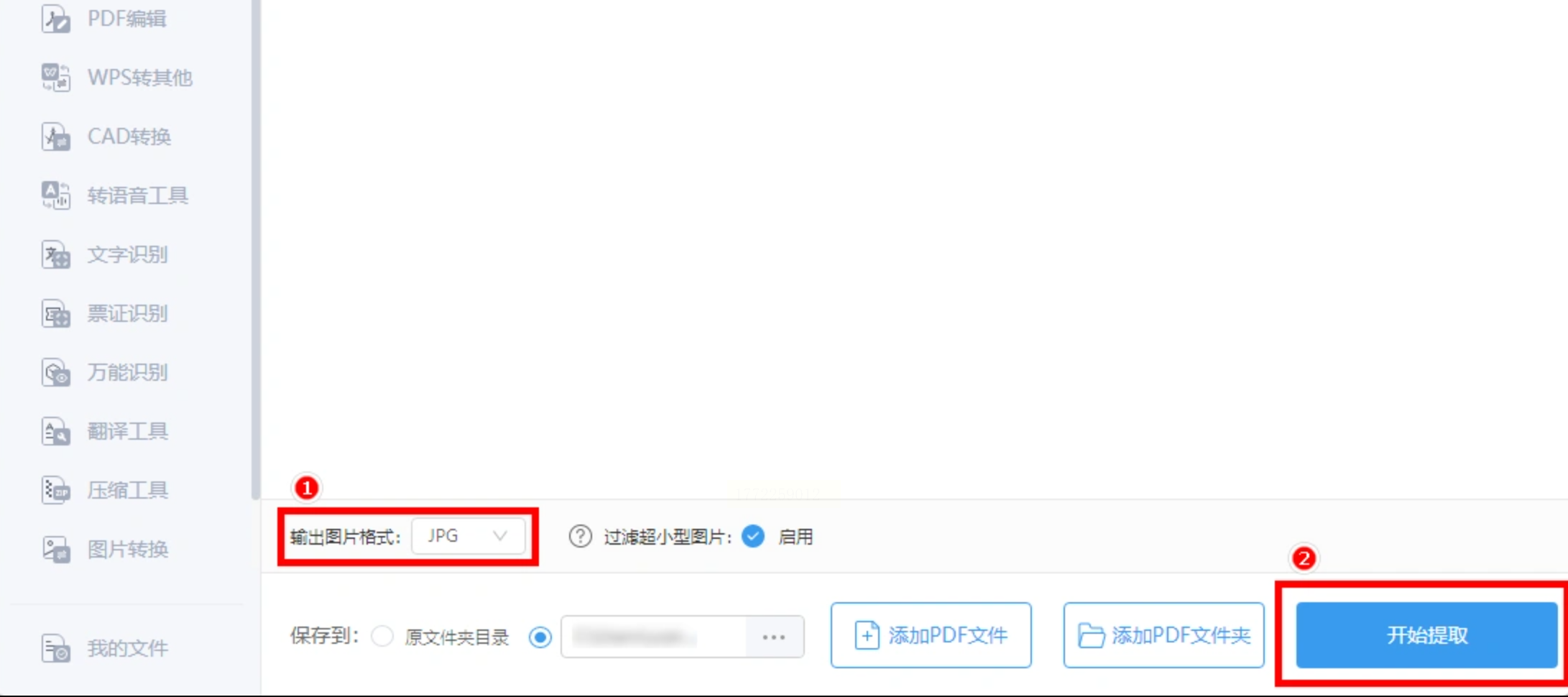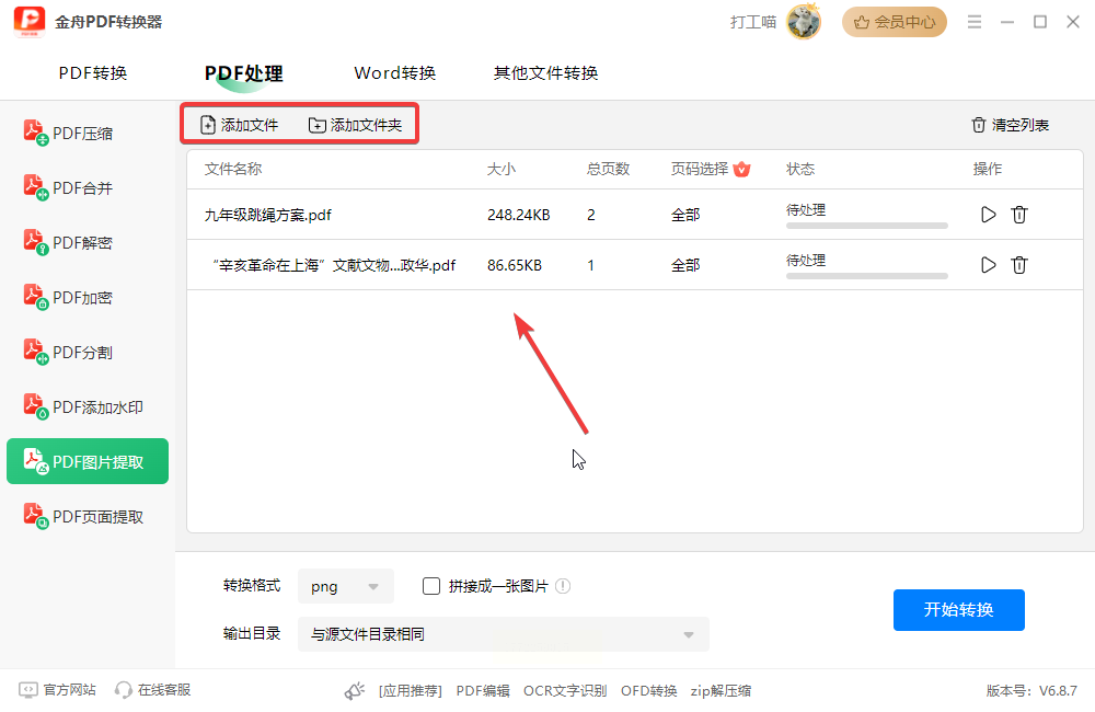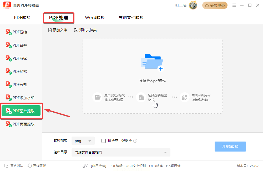 2. 选择提取图片功能:在左侧菜单里找到“PDF提取图片”(一般在“PDF处理”分类下),点击它。点击“添加文件”按钮,或者直接把PDF文件拖到软件窗口里(就像拖文件到文件夹一样)。如果有多个PDF,重复点“添加文件”或继续拖。