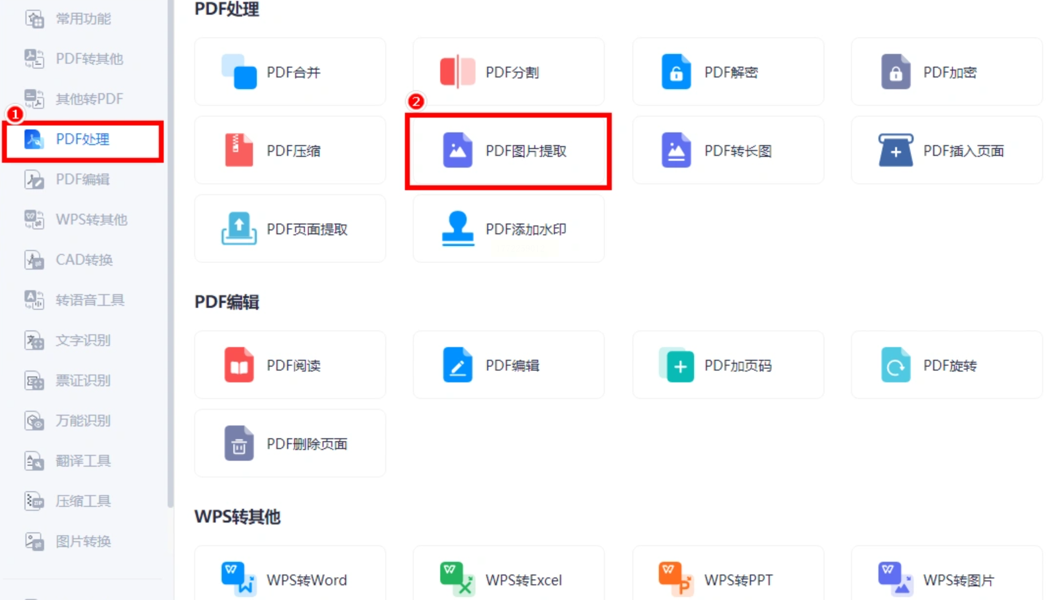 2. 进入图片提取界面:打开软件后,左边菜单点“PDF处理”,右边找到“PDF图片提取”,点击进入。