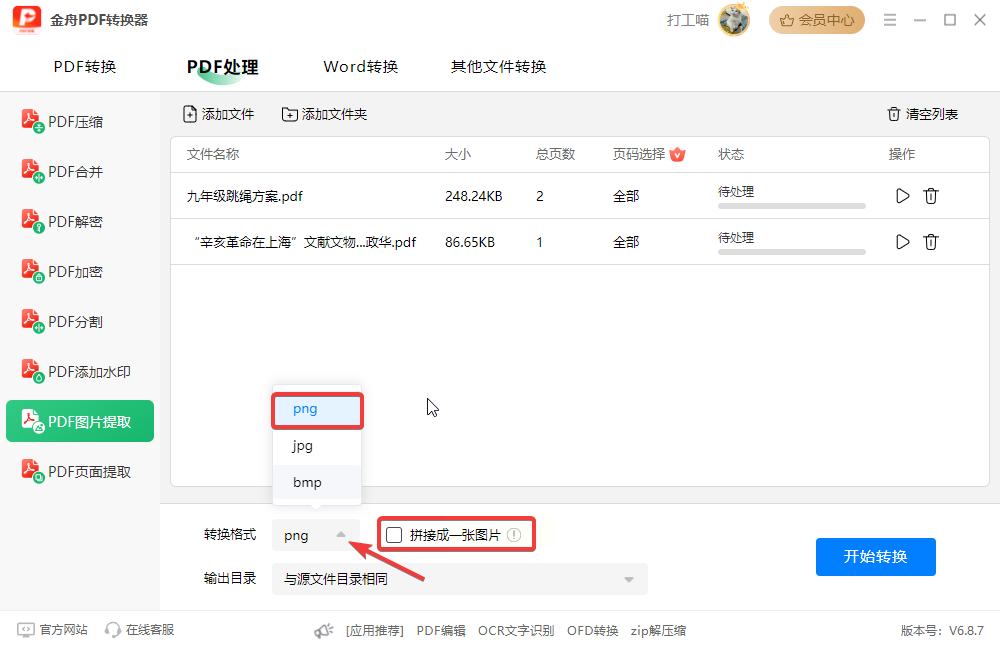 3. 选择格式和合并:在下方格式里选你要的图片格式(PNG、JPG、BMP,选PNG质量高),还可以选“合并图片”(如果PDF里图片是连续的,想合并成一张就选“是”)。
