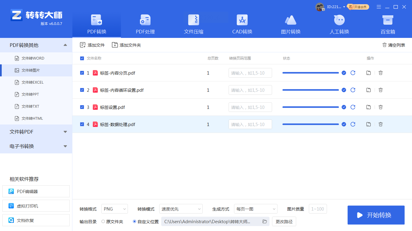 4. 开始转换:点“开始转换”,等软件处理完成(一般1-2秒一个PDF),提示“转换成功”。