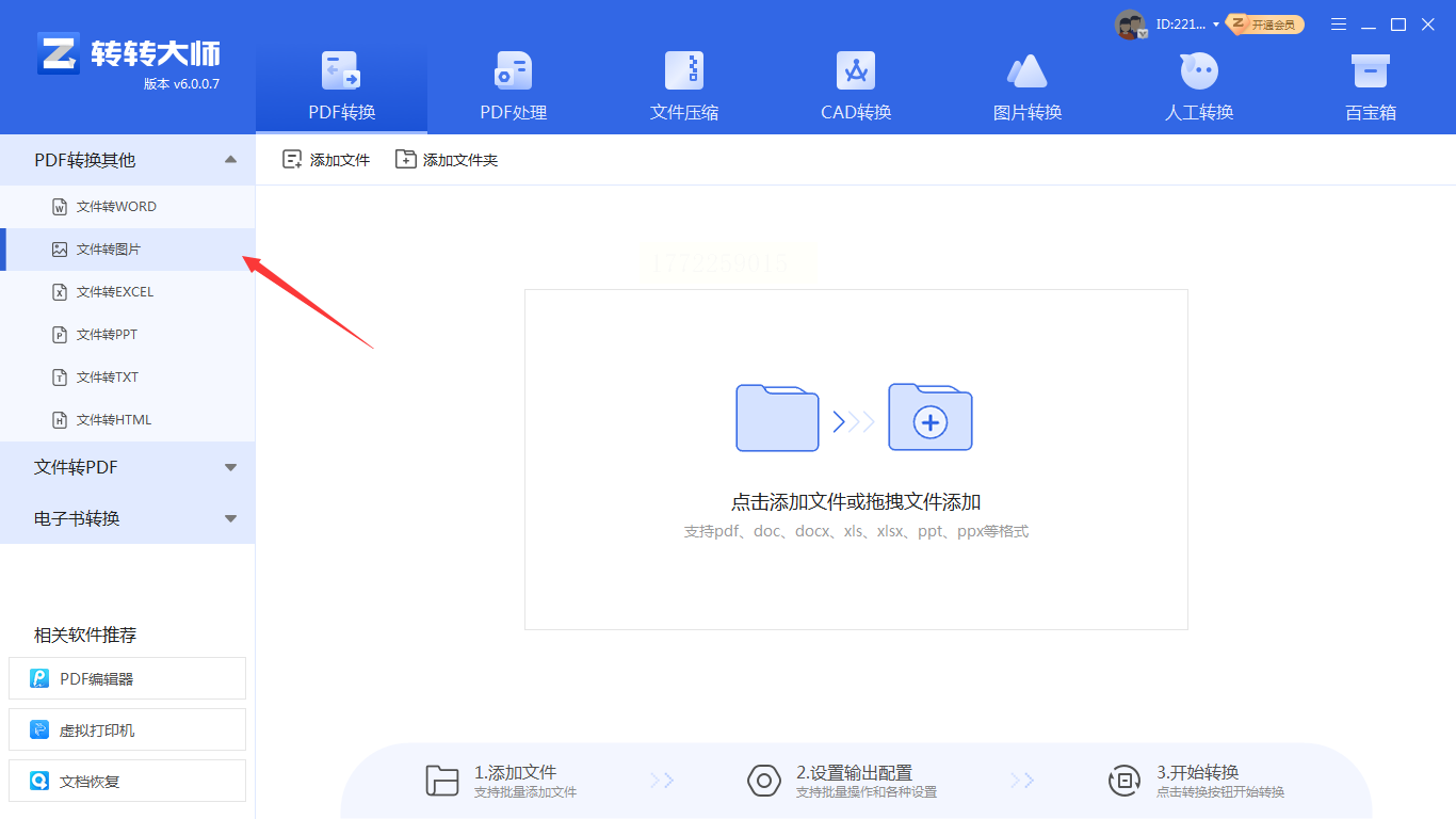 2. 选择功能:打开APP后,点“PDF转换”→“文件转图片”(图标是PDF+图片的样子)。