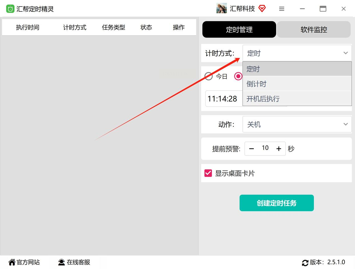 首先,打开已经安装好的“汇帮定时精灵”。软件界面很友好,找到“定时管理”这个选项卡(通常在左侧菜单栏),点进去后你会看到很多定时任务的模板,比如定时关机、定时启动程序等,咱们就选“定时清理”相关的选项。