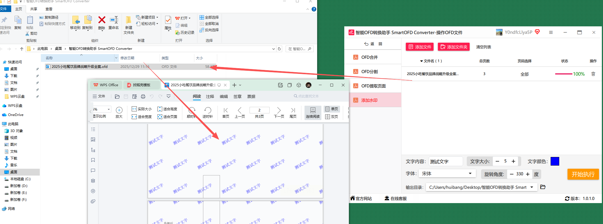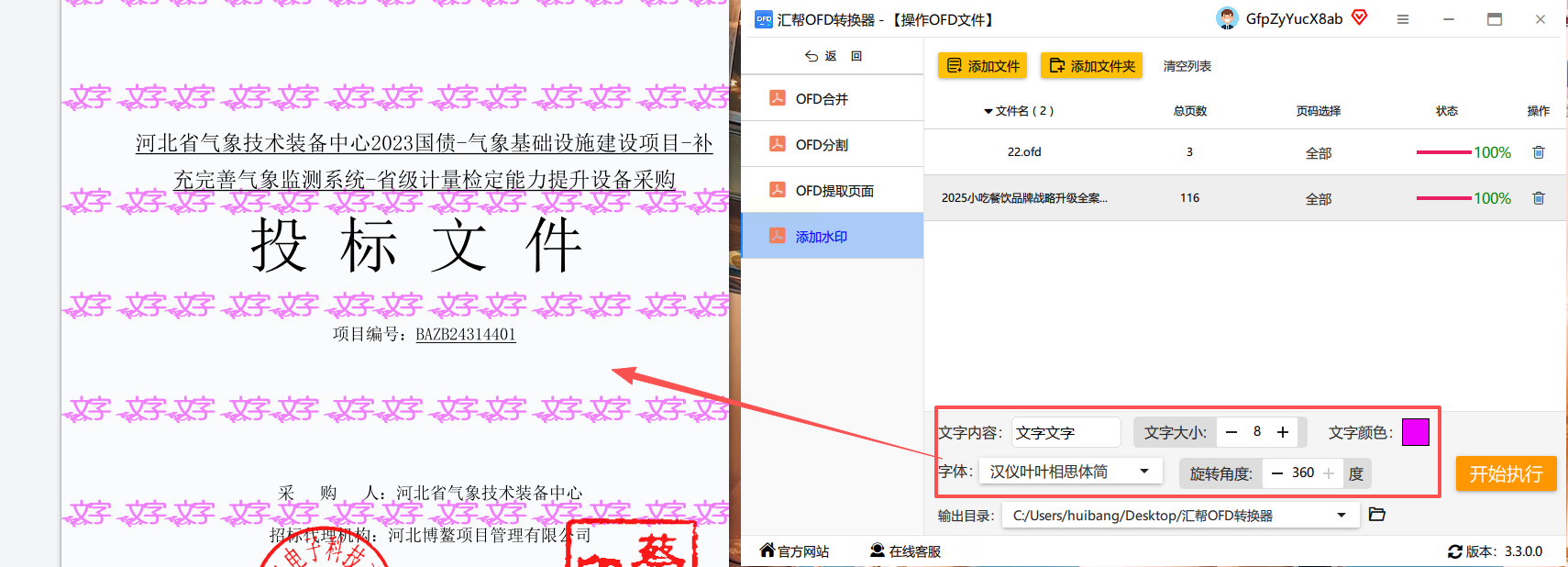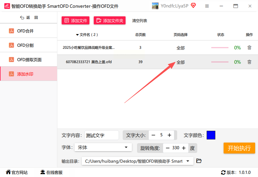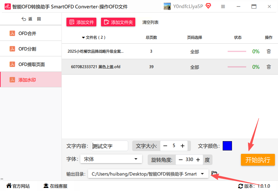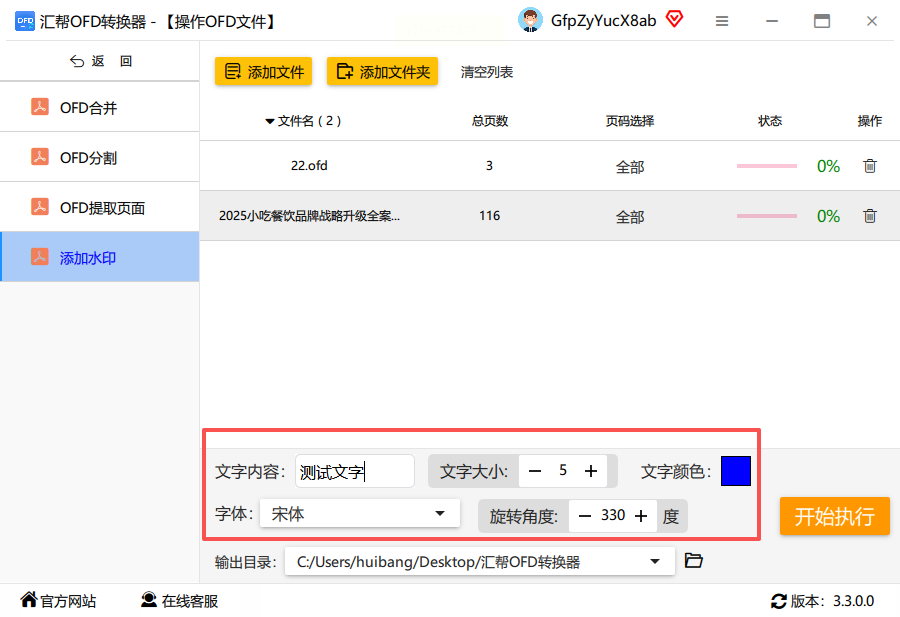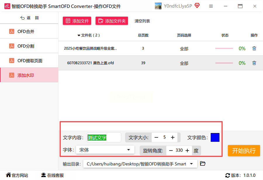 7. 开始处理文件:确认所有参数设置无误后,点击“开始执行”按钮,软件将自动为所有上传的OFD文件添加水印并生成新文件。处理过程中会显示进度条,方便用户了解当前状态。