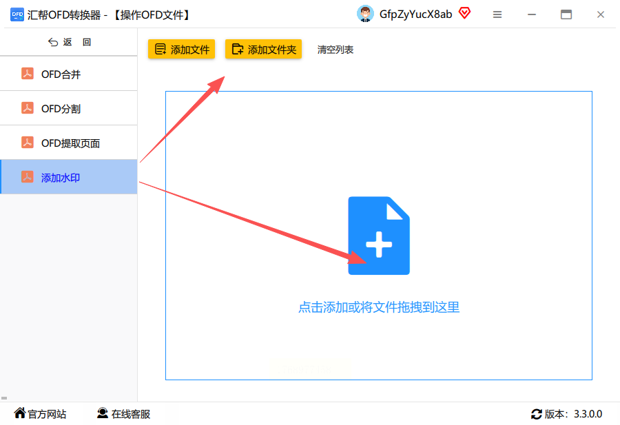 3. 上传OFD文件:进入操作界面后,在左侧功能栏中选择“添加水印”功能。此时,右侧会出现文件上传区域,点击“添加文件”按钮,从本地文件夹中选择需要添加水印的OFD文件。支持批量上传,可同时添加多个文件进行处理。