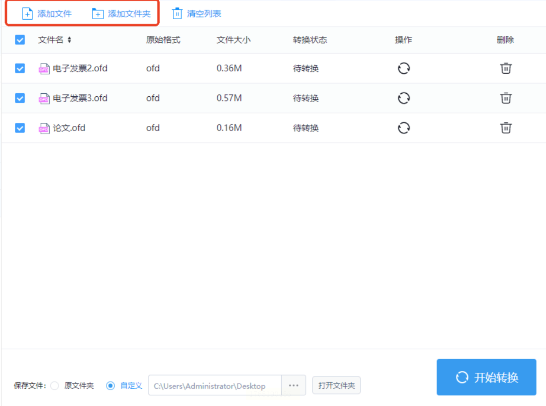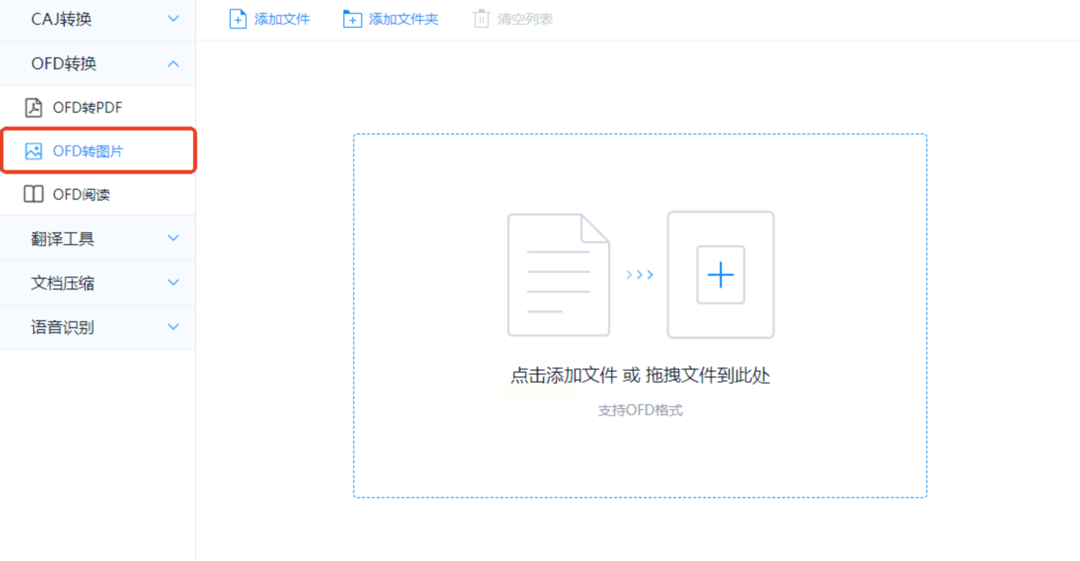 步骤二:在转换类型中,明确选择“OFD转图片”。随后,通过点击“添加文件”按钮或将OFD文件直接拖拽至软件窗口的指定区域,来导入您的文档。该软件支持批量添加,可显著提升多文件处理效率。