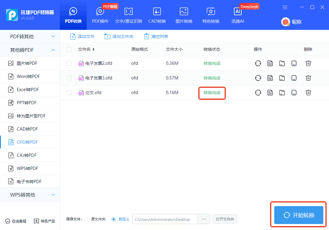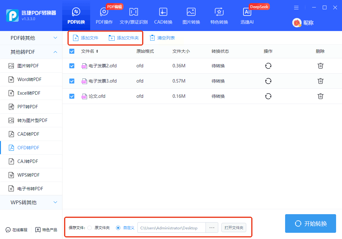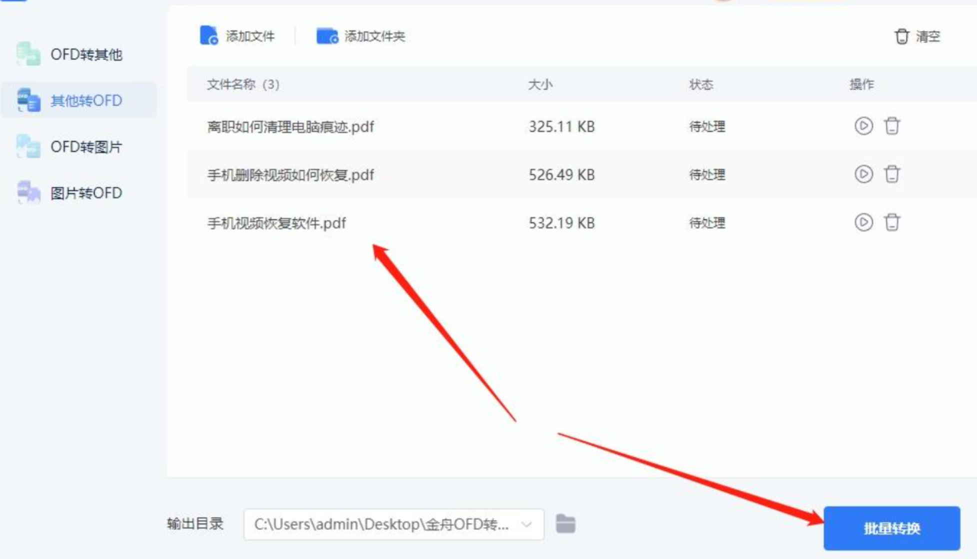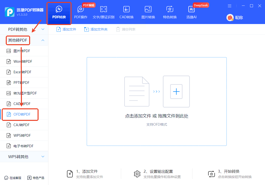 - 步骤二:选择「OFD转PDF」功能,支持单文件或多文件批量处理。
