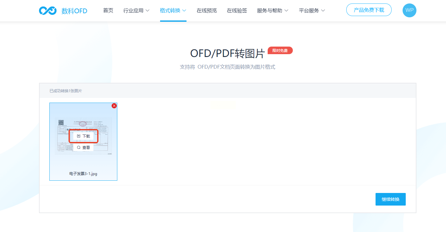 - 步骤一:进入数科OFD平台,选择「格式转换」功能下的「OFD/PDF转图片」。