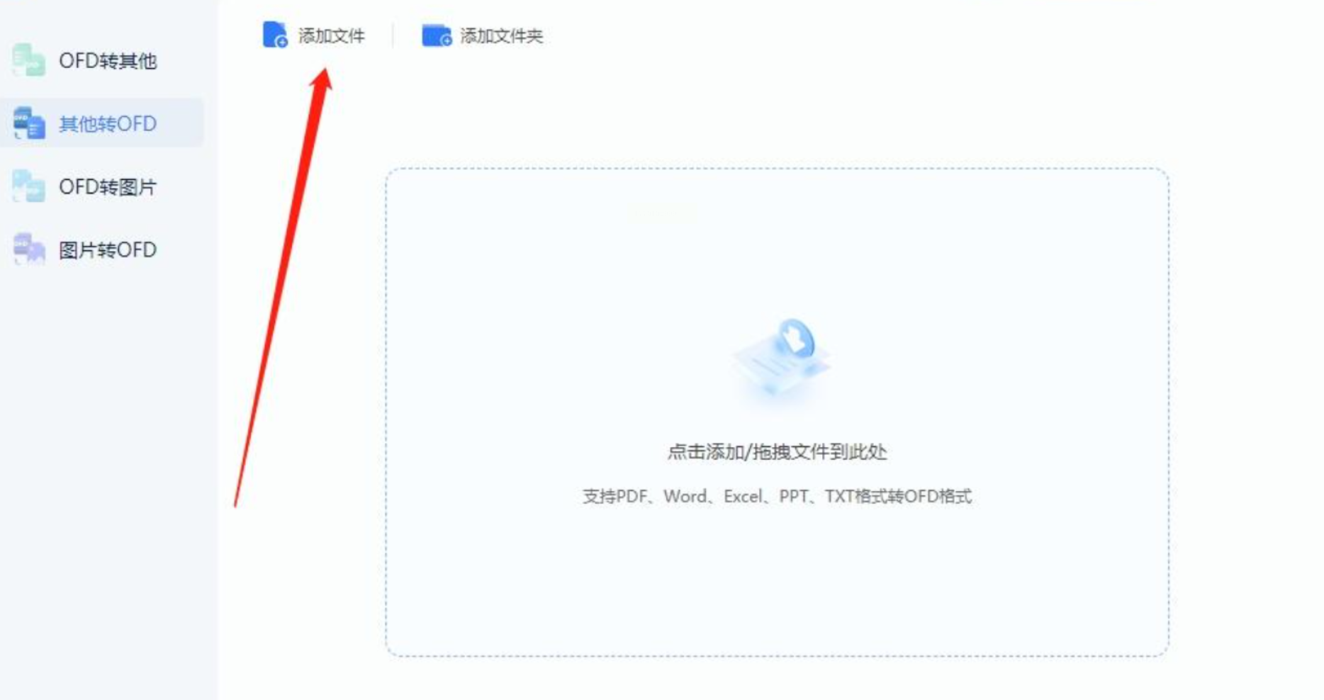 - 步骤二:通过「添加文件」或「拖放区域」批量导入需要转换的PDF文件,支持PDF、JPG等图片格式直接转为OFD。