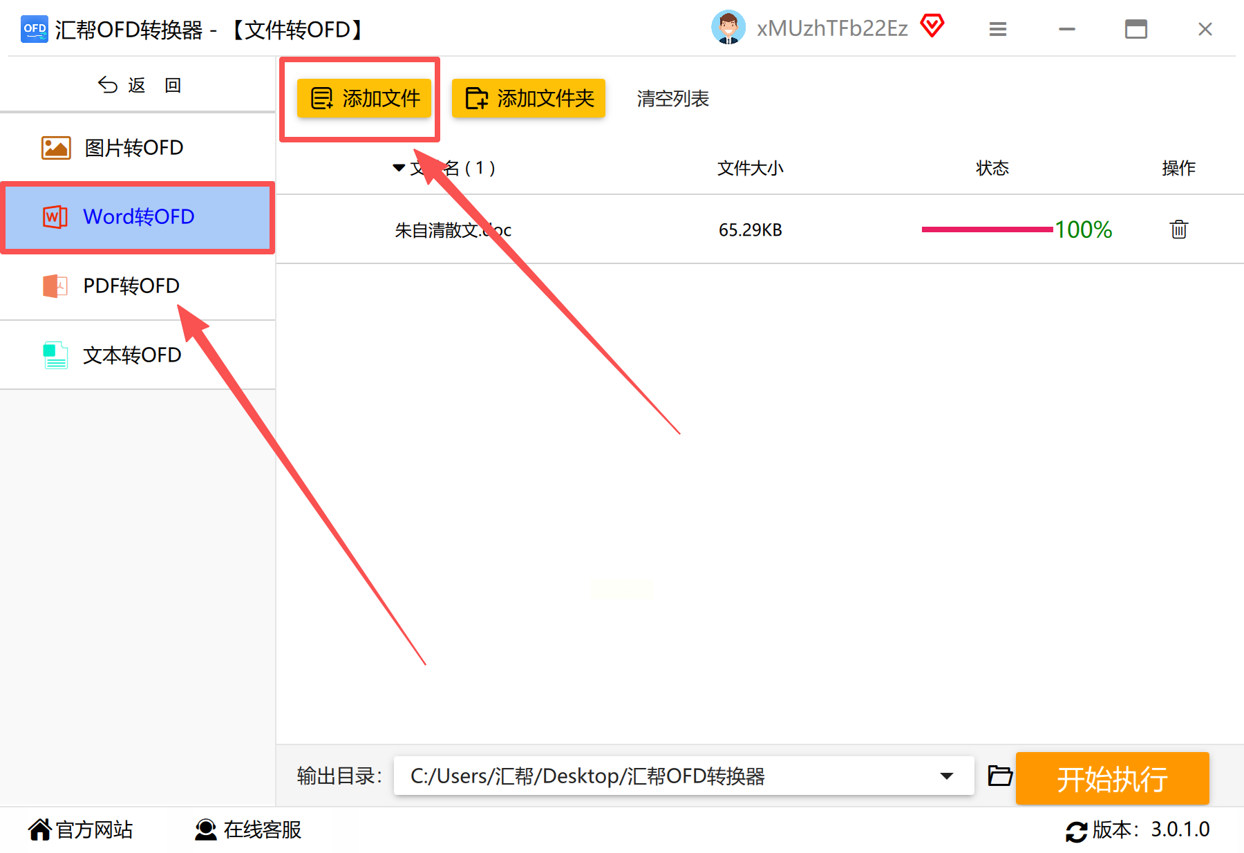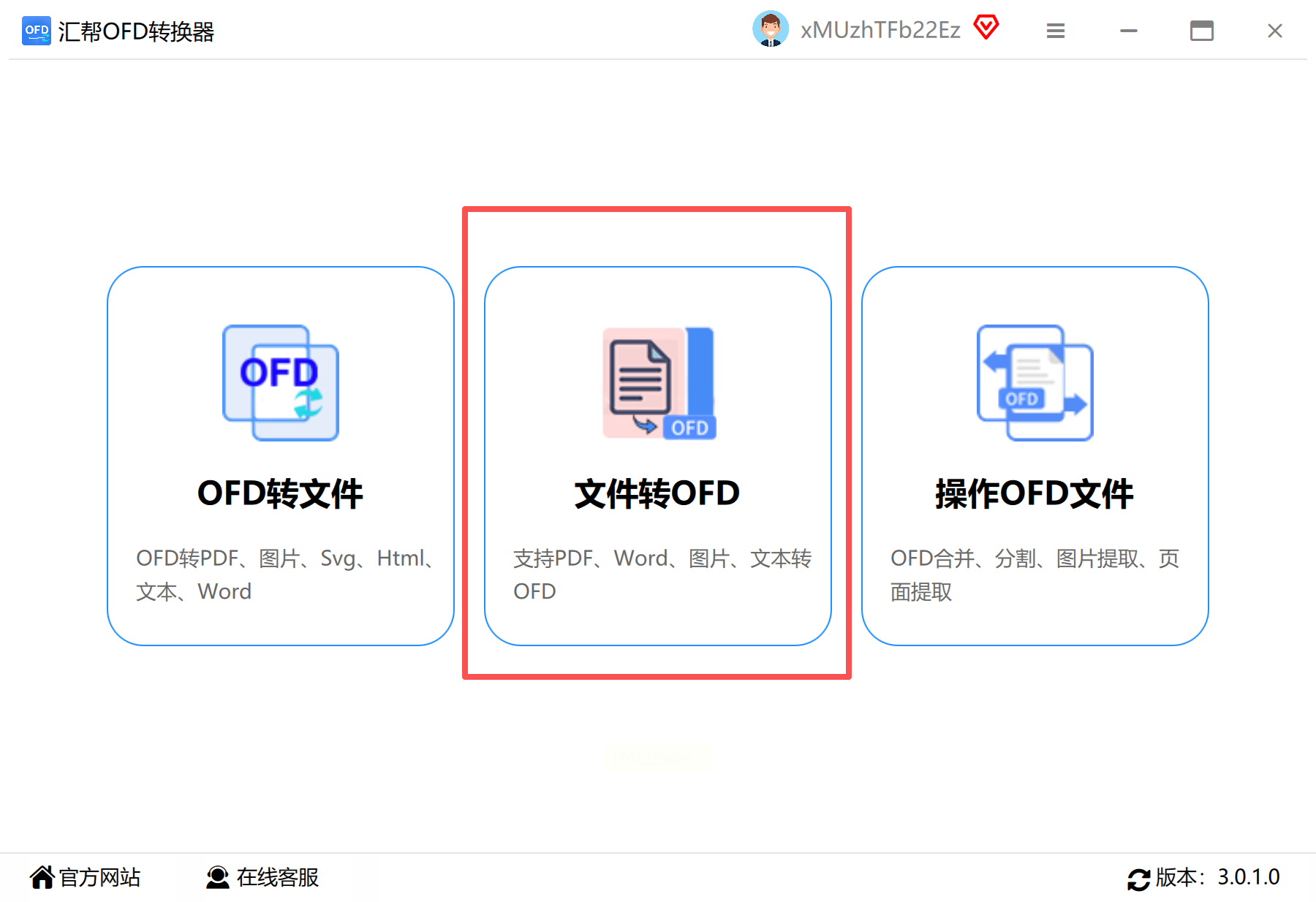 打开汇帮OFD转换器后,在主界面左侧功能区中选择“文件转OFD”模块。该软件支持PDF、Word、图片、文本等多种格式的导入,满足不同来源文档的转换需求。