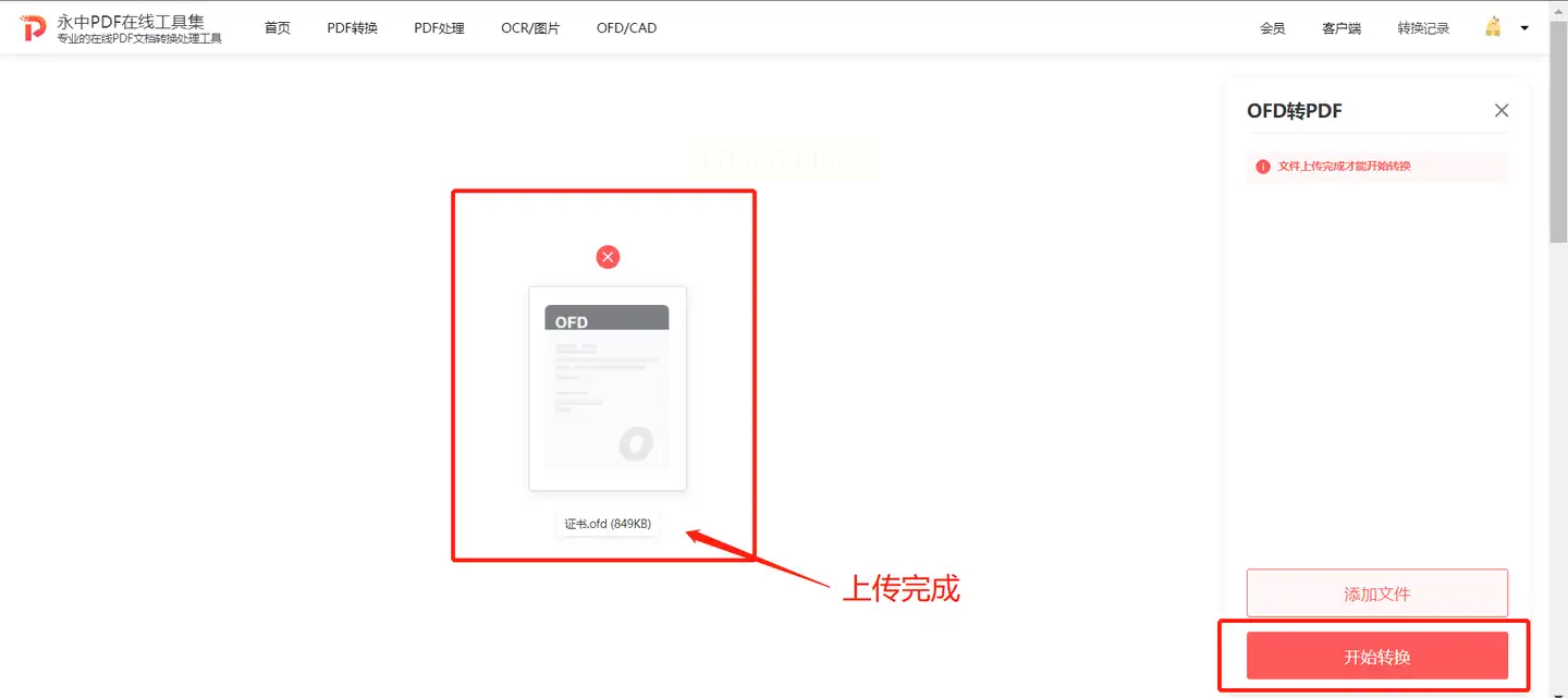 步骤二:进入转换页后,点击“上传文件”按钮,从电脑中选择需要转换的OFD文档。大部分在线工具都支持一次上传多个文件。