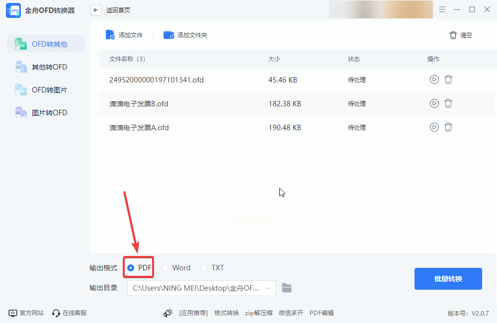 步骤二:添加文件同样支持拖拽和批量选择。将需要处理的OFD文件拉进来之后,记得在输出格式的下拉菜单中,明确选择“PDF”作为目标格式。