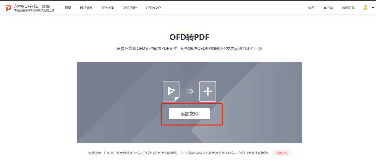步骤二:进入转换页面后,通过点击“添加文件”按钮来导入你的OFD文档。它很贴心地支持批量操作,你可以一次性选中多个文件,或者更简单地,直接将文件拖拽到软件窗口的指定区域。