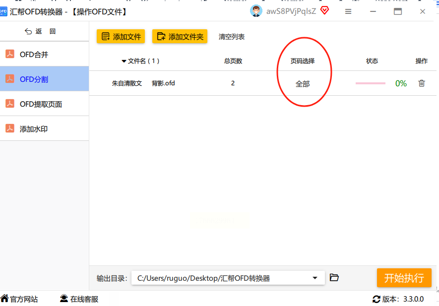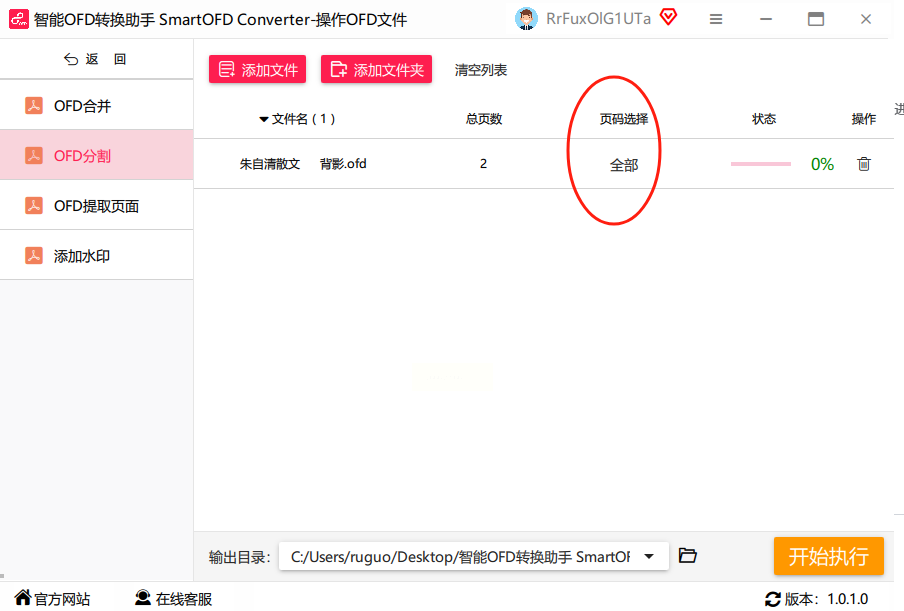 4. 调整输出设置:选好页码后,记得设置保存位置!在软件下方找到“输出目录”,点“浏览”按钮,选一个你容易找到的文件夹(比如桌面新建个“OFD分割结果”文件夹)。最后点“开始分割”,软件就会自动处理啦。