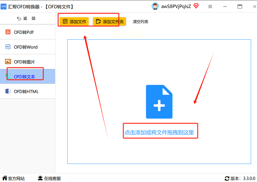 左边菜单里找到"OFD转文本",点一下。然后右边会出现"添加文件"的按钮,你可以点它选文件,也能直接把OFD文件拖到软件窗口里。要是有一堆文件要转,直接把整个文件夹拖进去也行,超方便!