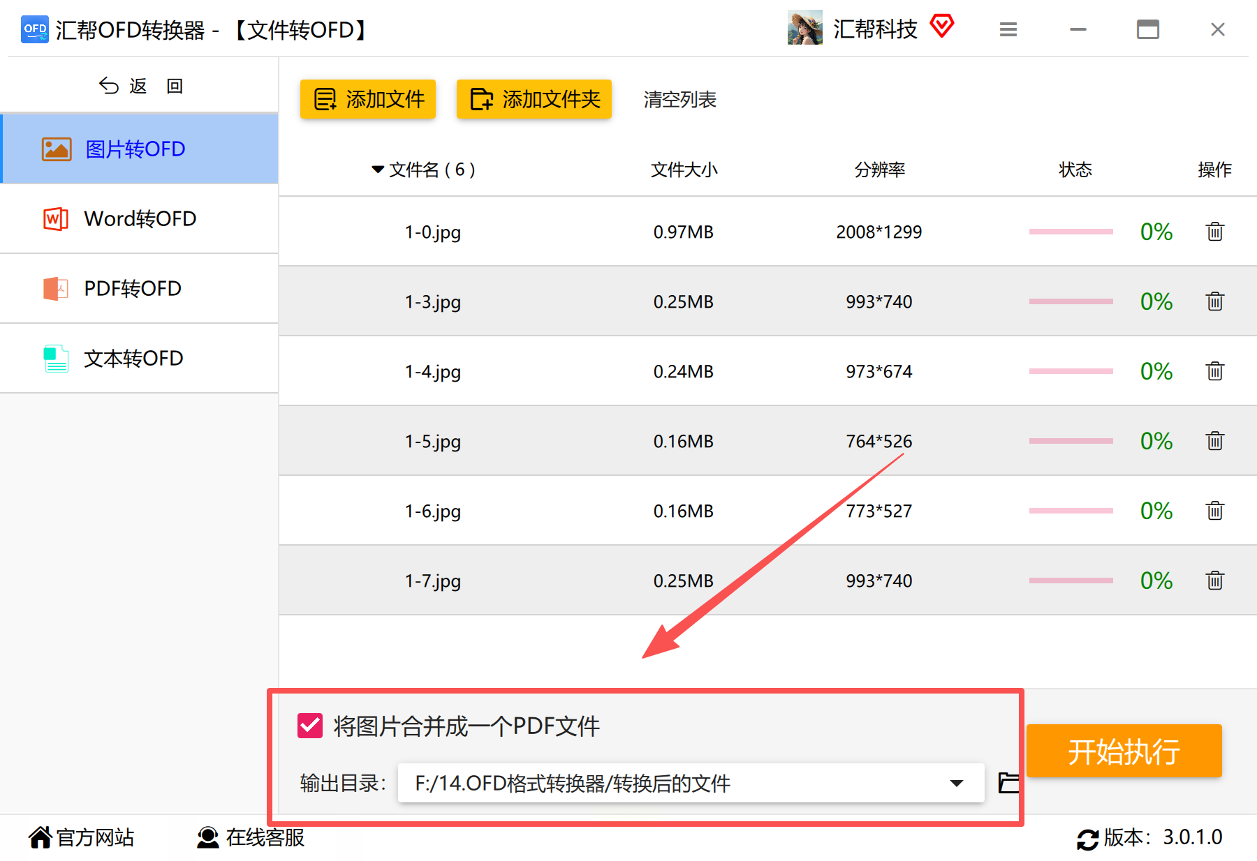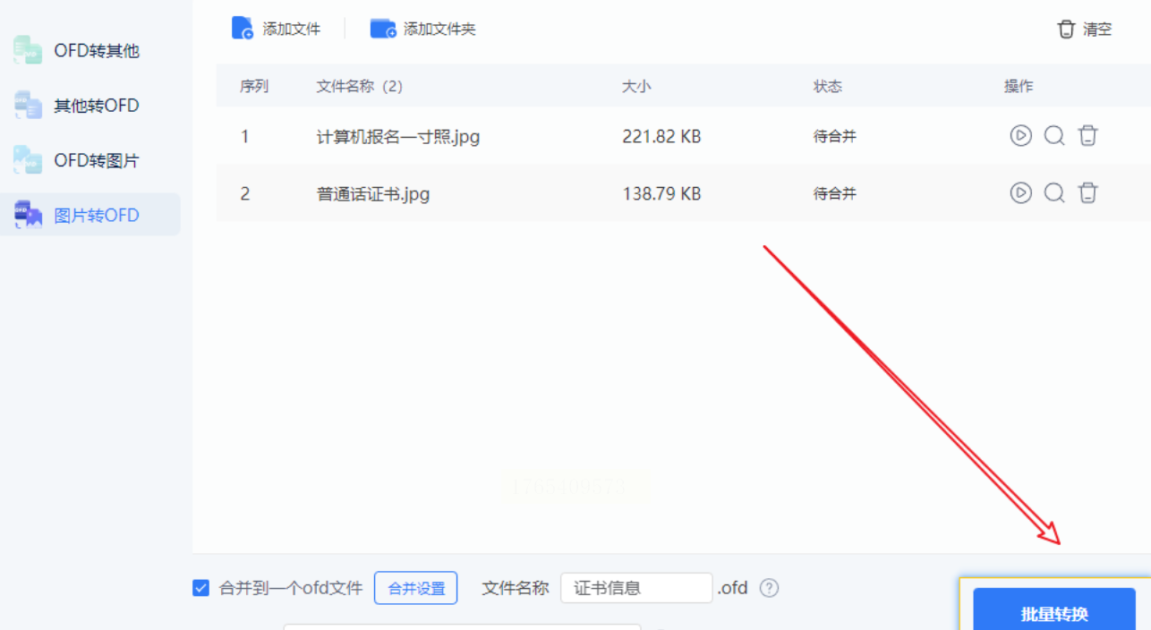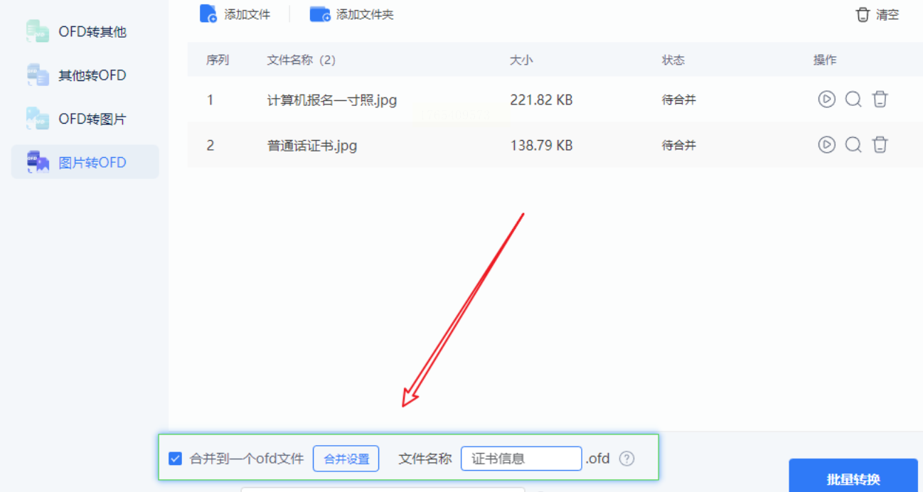 4. 添加完图片,看看软件底部。这里有个选择很重要:你是想把所有图片合并成一个OFD文件呢,还是每张图片生成单独的OFD?根据你需要来选。然后记得点“浏览”选个输出文件夹,不然转换完的文件可能找不到哦。