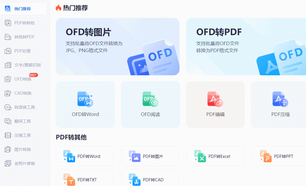 打开软件后,在主界面左侧导航栏找到"格式转换"模块,点击"OFD转PDF"功能按钮。该界面集成了丰富的转换选项,包括PDF、JPG、PNG等常见格式,满足多样化需求。
