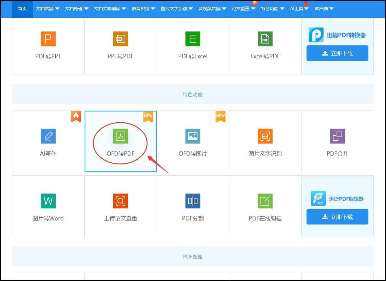 打开你的浏览器,在搜索框里输入工具名称就能找到官网。进入网站后,首页上排列着各种转换功能,找到“OFD转PDF”并点击。