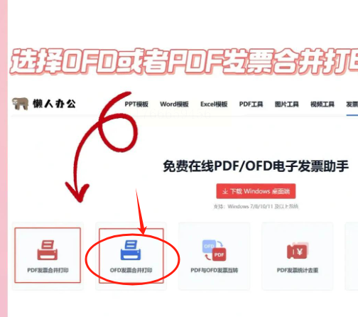 ① 打开懒人办公官网,首页点“发票工具”→“OFD发票合并打印”。这里直接选“合并打印”,界面很干净,不用找半天。