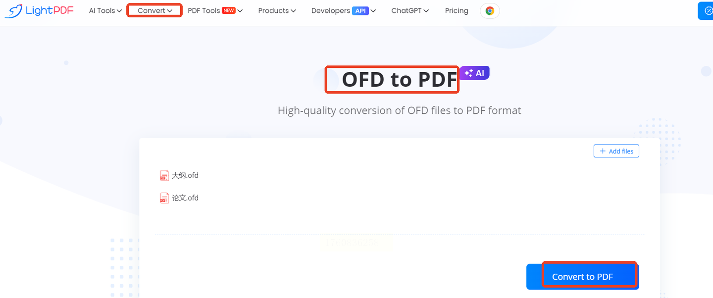 进入LightPDF官网后,在顶部导航栏选择“Convert”(转换)选项,展开的子菜单中找到“OFD to PDF”功能。免费版仅支持单文件转换,付费版解锁批量处理和高级选项。
