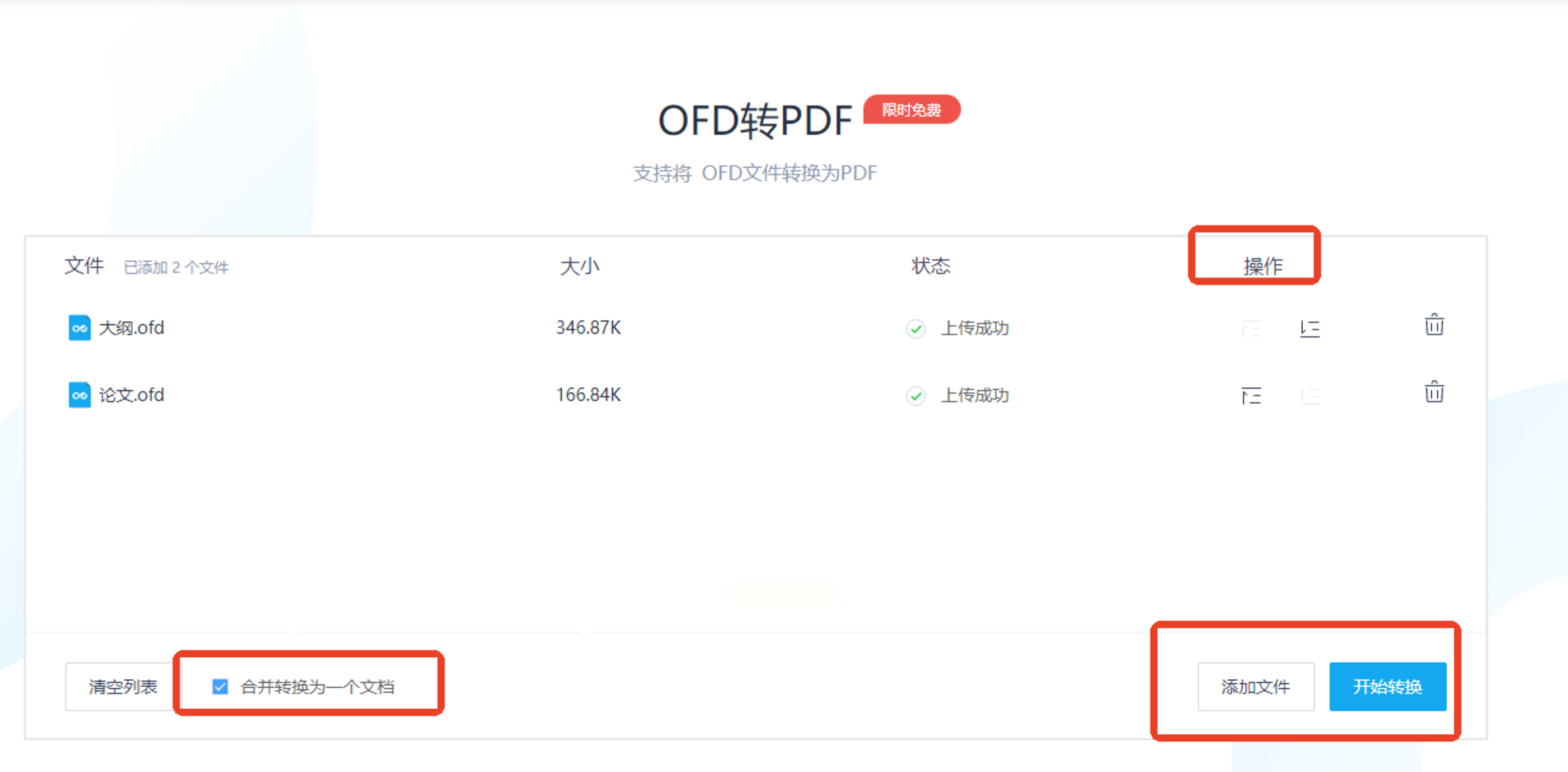 支持同时上传20个以内OFD文件,自动按上传顺序合并转换。每个文件最大支持200MB,免费版每日转换次数限制为5次。