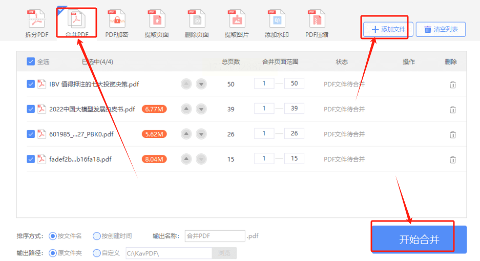 3. 合并PDF文件:转换完成后,打开软件中的“PDF操作”功能,选择“合并PDF”。在合并界面,点击“添加文件”,将刚才转换好的所有PDF文件导入。这里可以通过拖拽调整文件顺序,确保内容连贯。对于PDF文件较多的情况,可使用“全选”按钮快速导入所有文件,再通过排序按钮调整顺序。