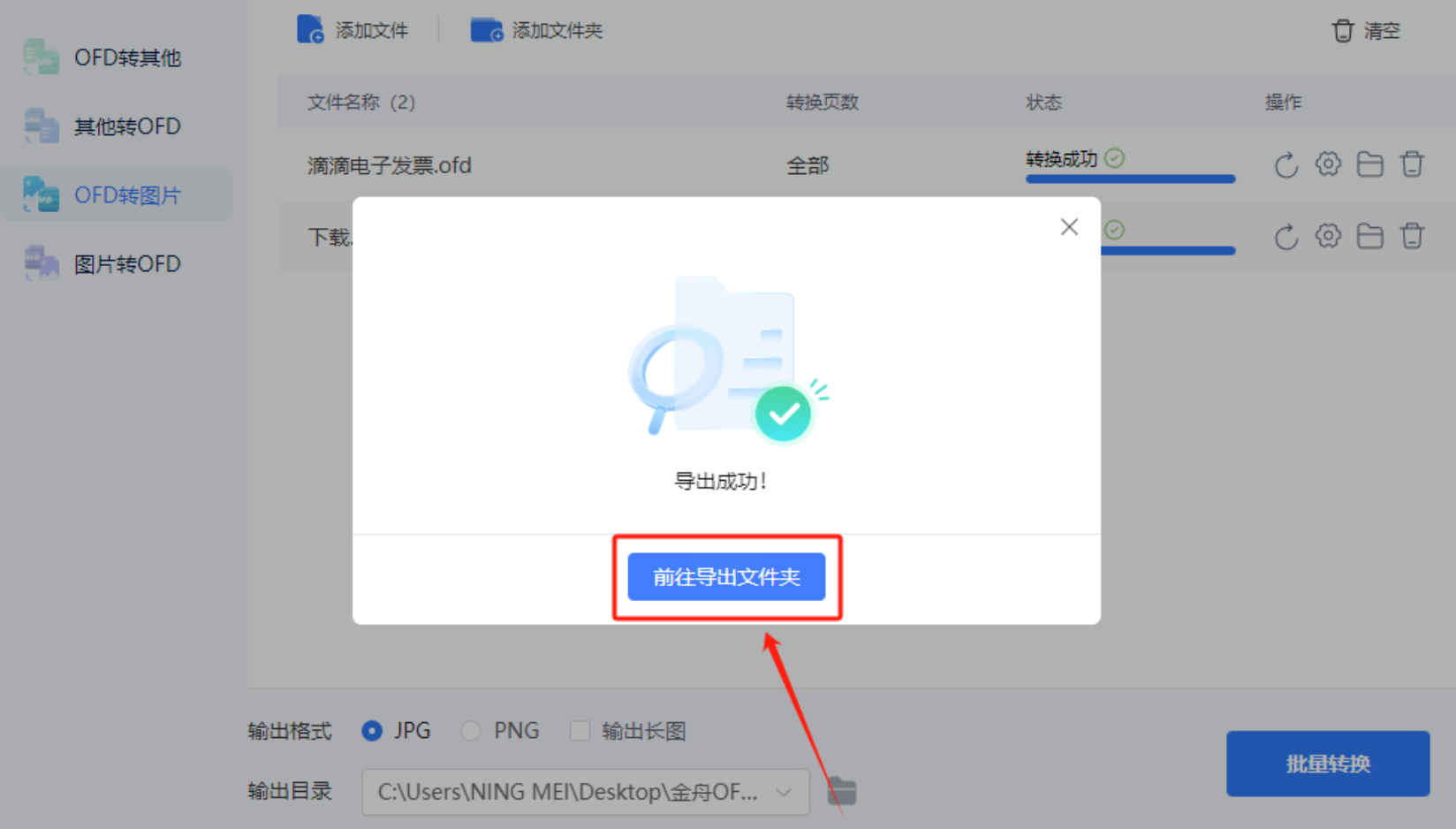 步骤六:转换结束后,系统会弹出提示。点击“打开输出文件夹”即可快速定位并检查生成的OFD文件。