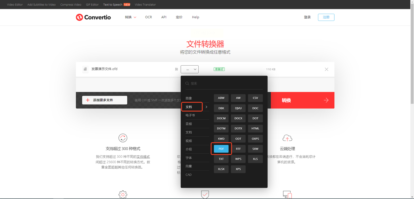 1. 打开Convertio官网(无需下载安装),在格式转换区域选择“PDF”转“OFD”。
