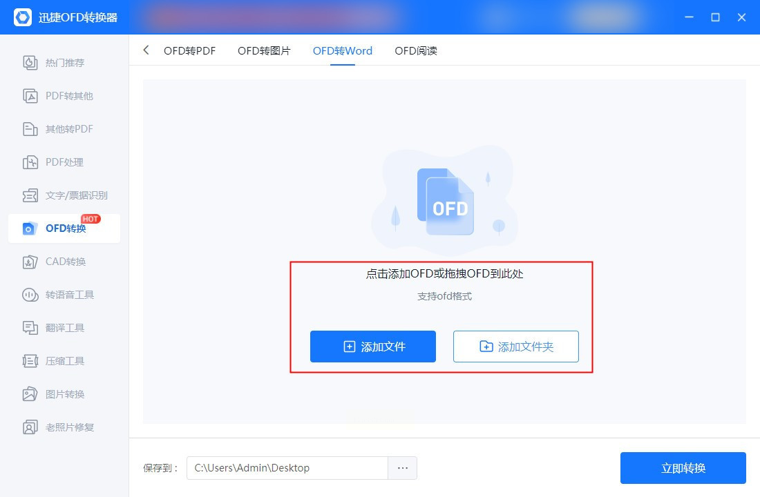 步骤二:通过点击“添加文件”按钮导入需要转换的OFD文档,你也可以直接将文件拖放到指定区域。