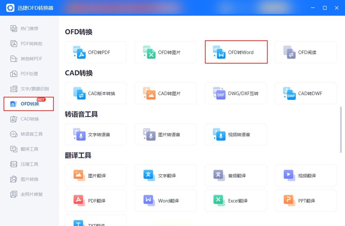 步骤一:启动软件后,进入“文档转换”专区,选择“OFD转Word”功能。