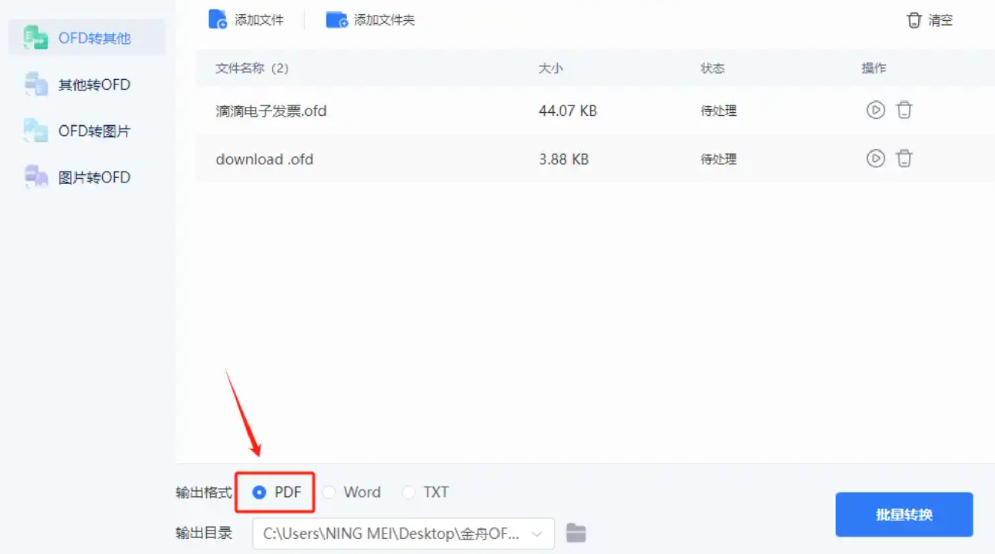 3. 在输出格式中勾选「OFD」,确认后点击「开始转换」;