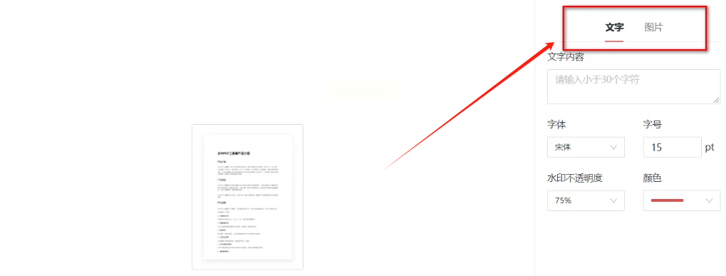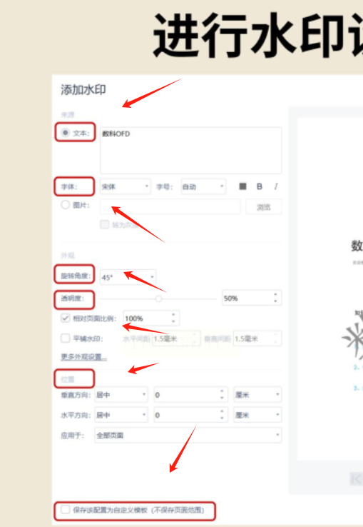 - 文字水印:输入内容,比如“机密文件”,然后选字体、字号(一般16号比较合适),颜色和透明度。