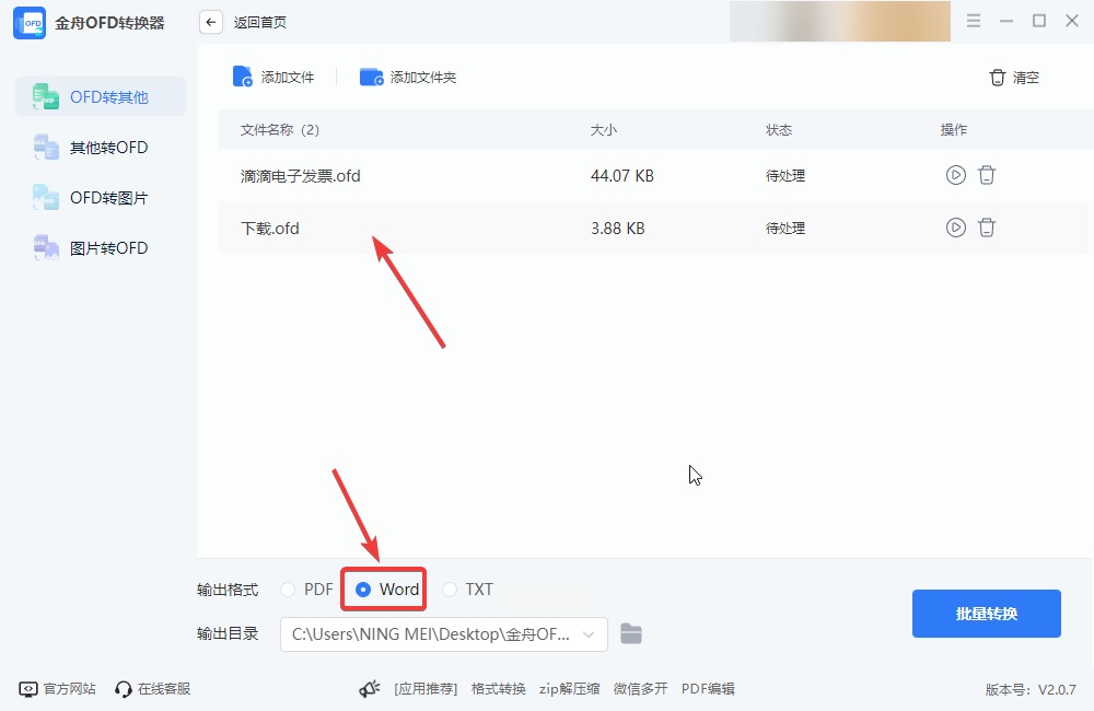 左侧导航栏明确勾选“OFD转Word”选项(此步骤为转换必要条件,需确保功能选项已激活)。