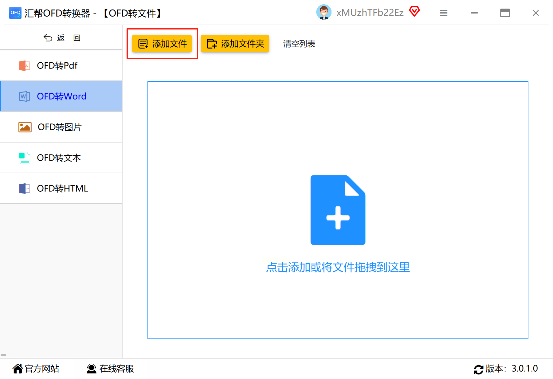 点击“添加文件/文件夹”按钮,支持通过文件浏览或直接拖拽OFD文件至操作区,单窗口可批量导入文件,适合处理多个文件转换需求。