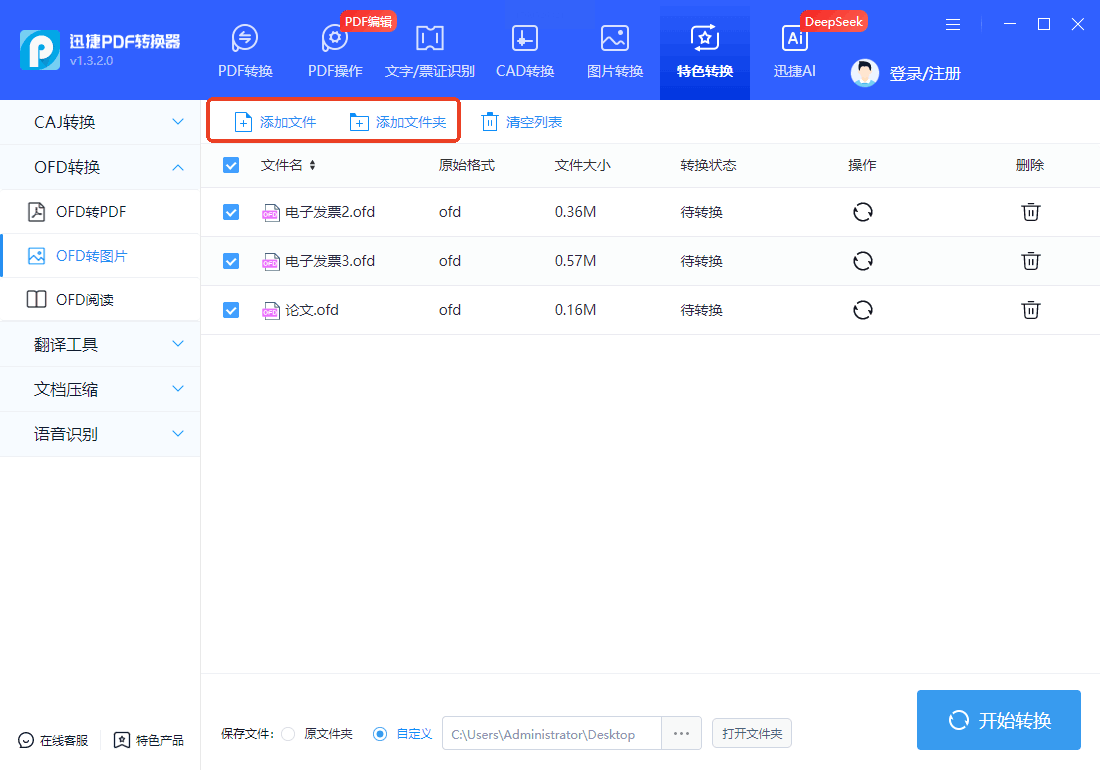 步骤三:点击“添加文件”来导入单个OFD文档,或者点击“添加文件夹”直接导入整个文件夹内的所有OFD文件,这对于批量处理非常高效。