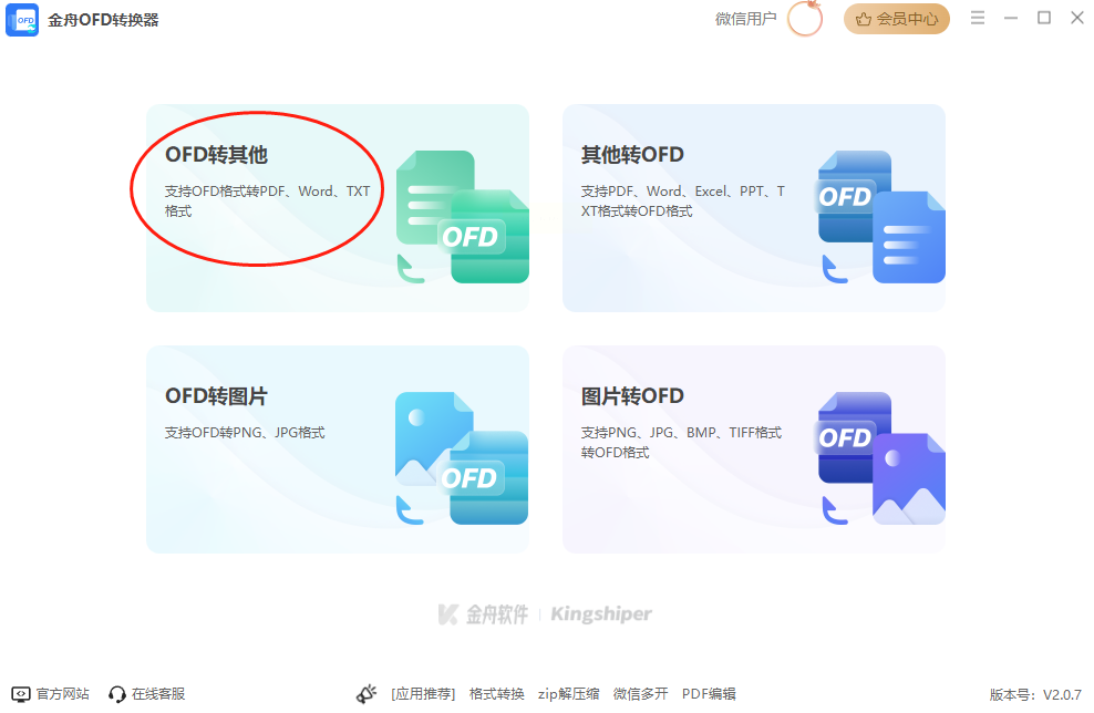 打开软件后,主界面会显示多种转换模块入口。需明确选择"OFD转Word"功能标签,确保转换类型设置正确——该软件支持PDF、图片、SVG等格式互转,但仅勾选"OFD转Word"才能触发针对性的文字识别与格式还原引擎。