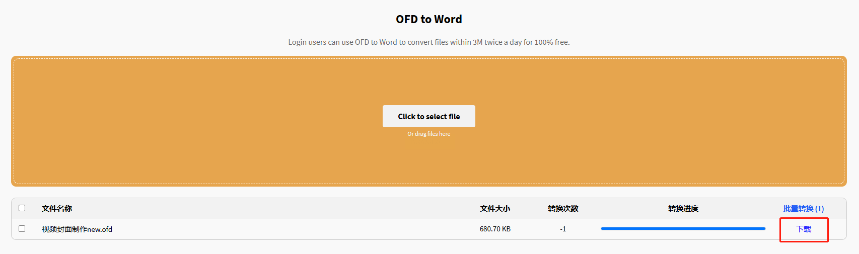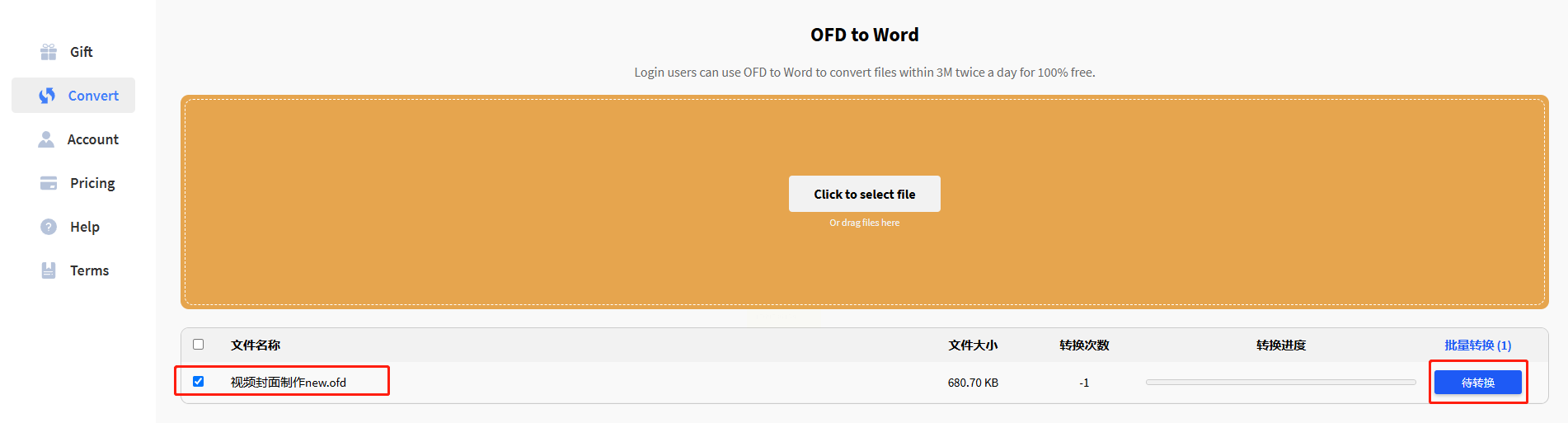 点击"Select files"按钮后,系统会弹出文件选择窗口。支持拖放操作,且对文件格式有明确提示(仅接受OFD、PDF、DOCX等标准格式)。若文件体积超过20MB,需先压缩处理,否则转换过程会出现超时警告。