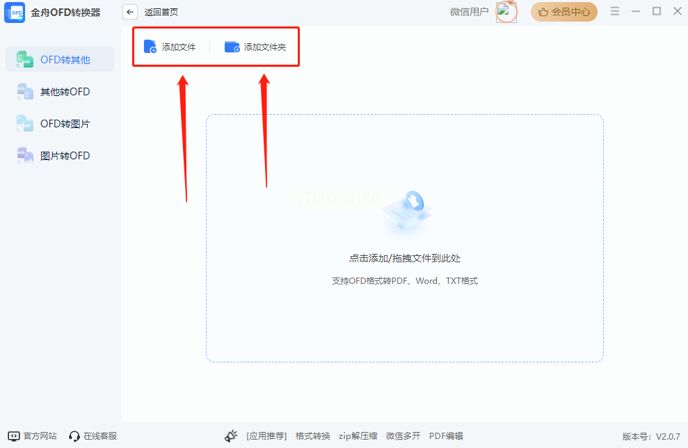 支持三种导入方式:直接点击"添加文件"按钮选择单个文档,或通过"添加文件夹"批量导入;也可直接将OFD文件拖拽至左侧操作区,系统会自动识别文件完整性。批量处理时,软件会保留原文件的层级结构,便于后续分类管理。