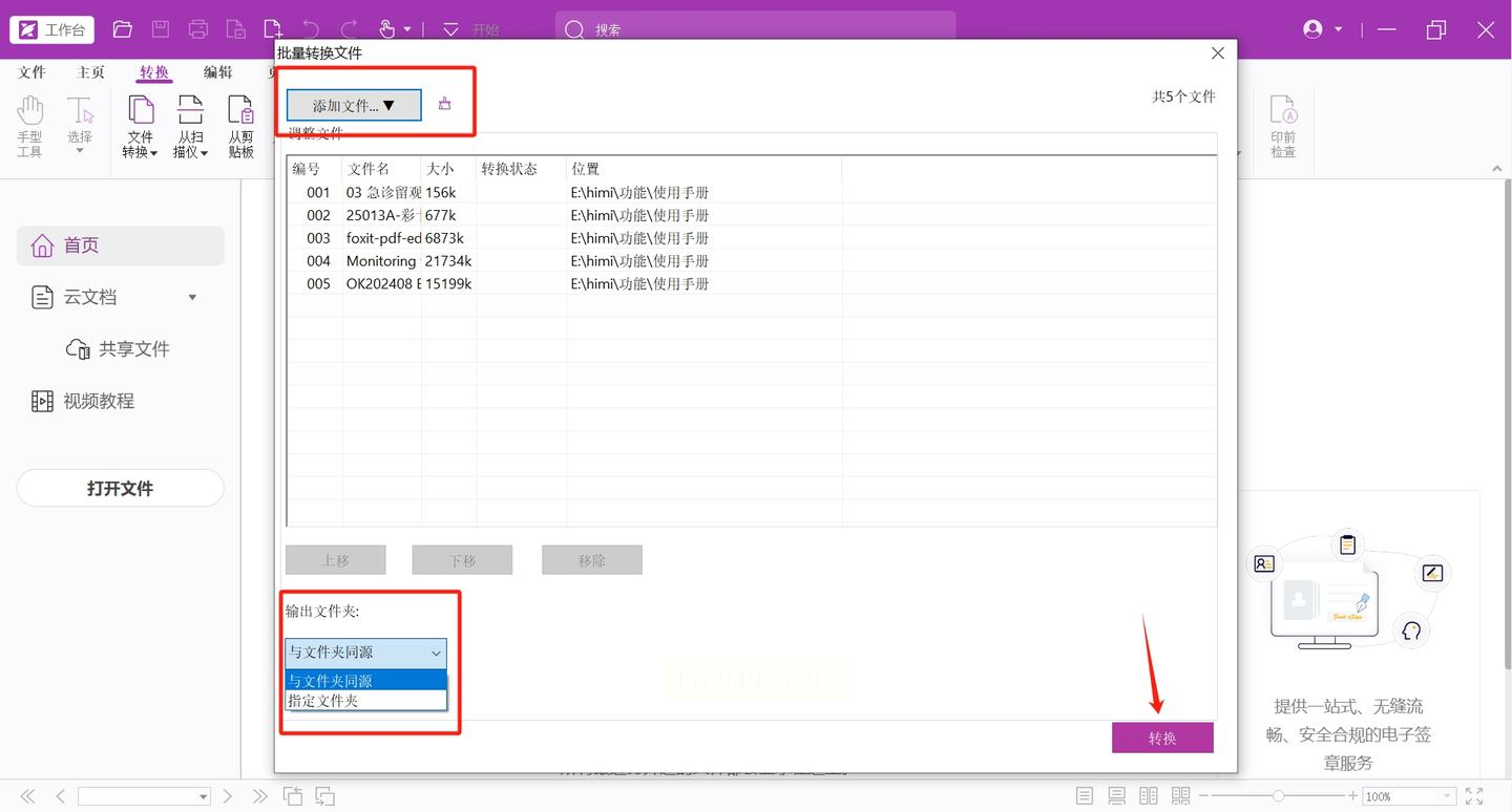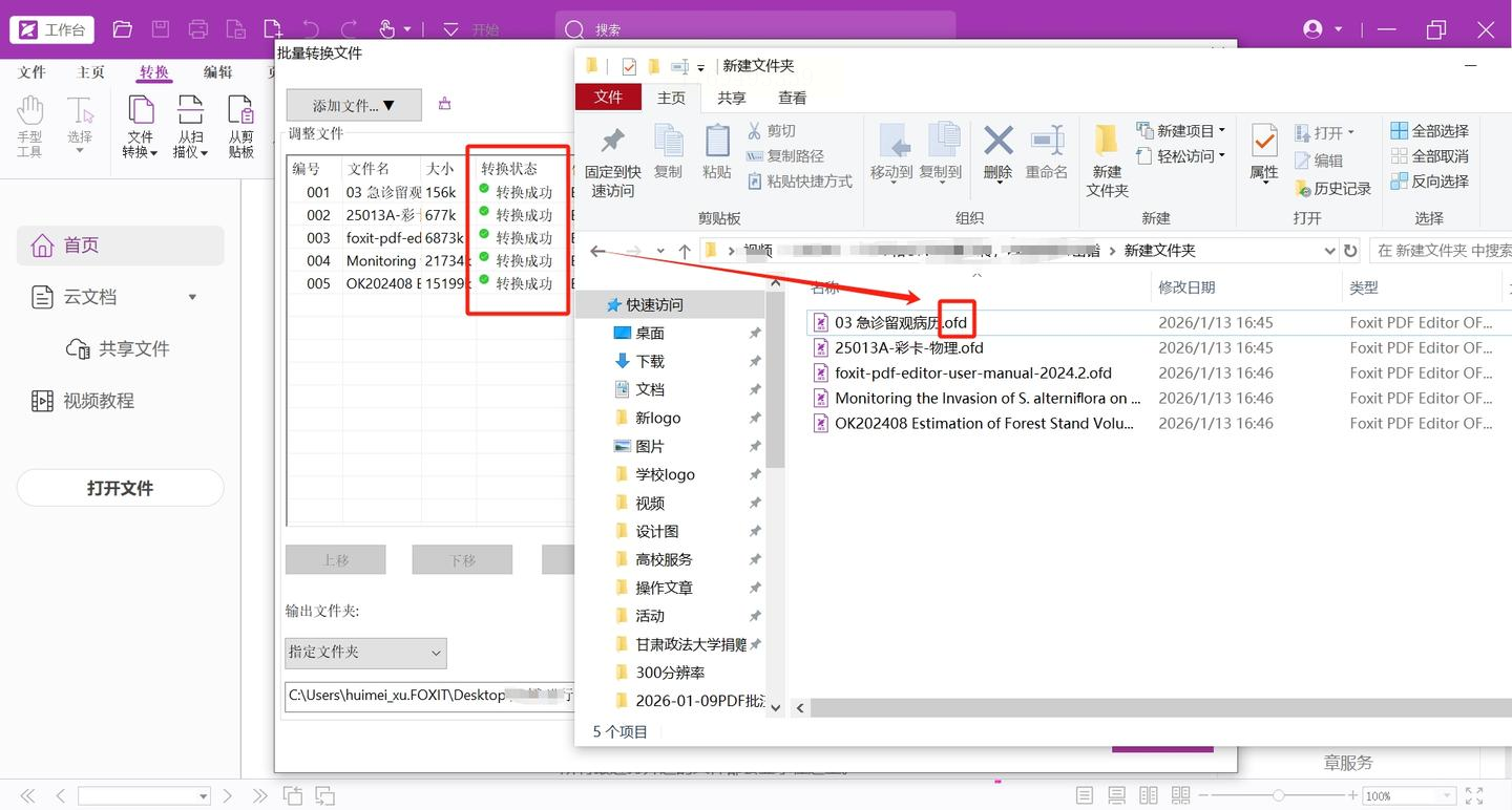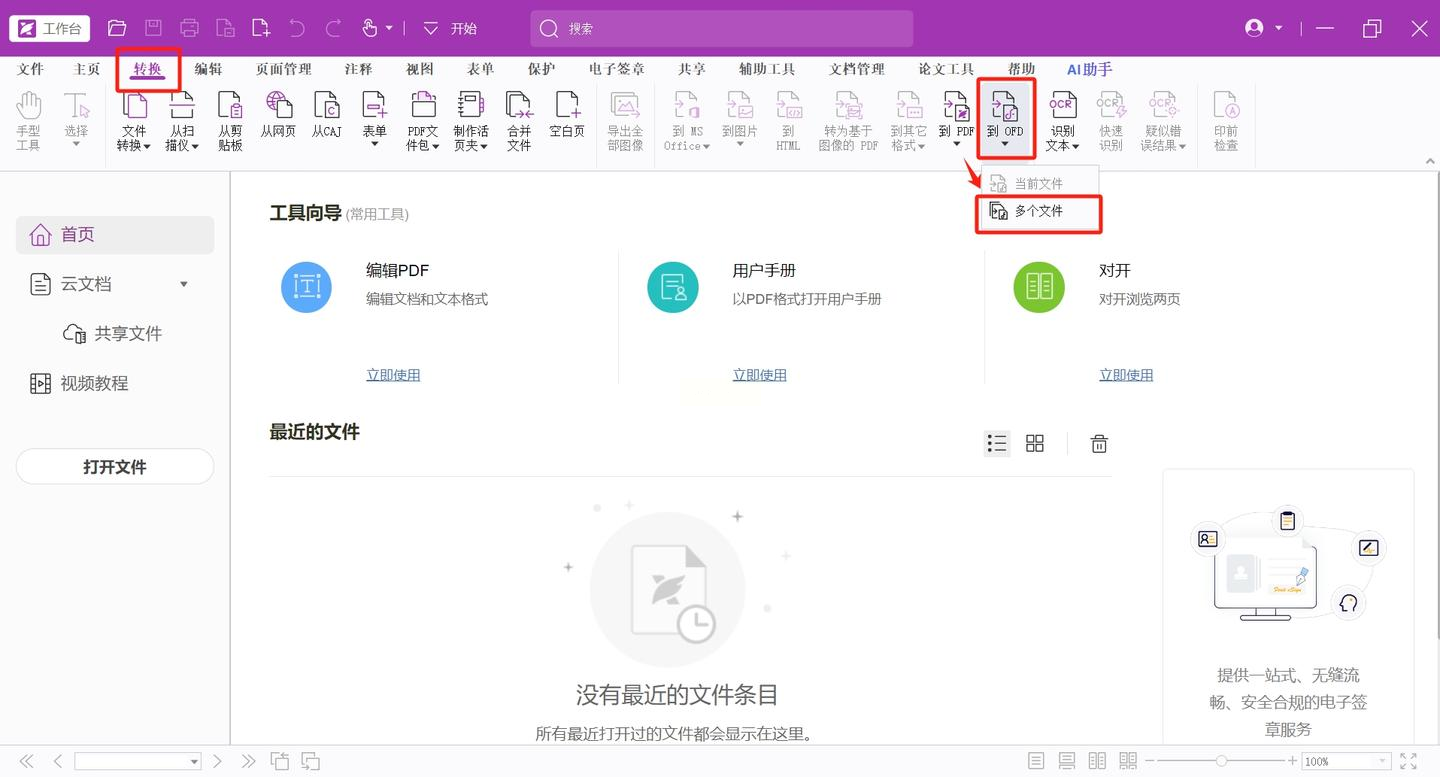 1. 模块定位:打开福昕编辑器后,在顶部功能区找到「PDF工具」→「转换」→「导出为OFD」。此路径下包含「单个文件」和「多个文件」两种模式。