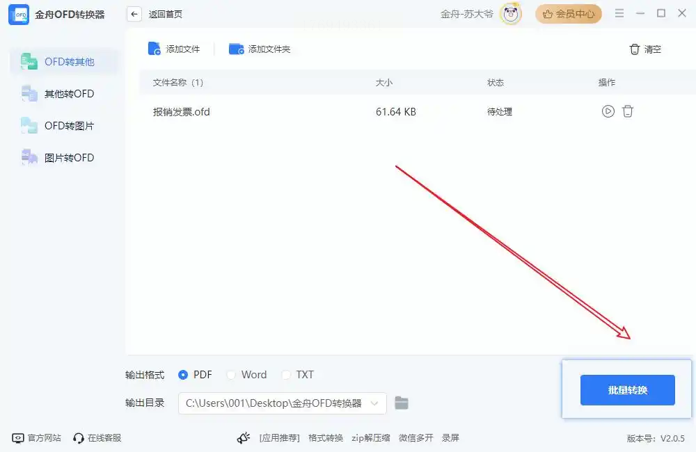 1. 功能选择:打开软件后,在主界面左侧点击「文件格式转换」,然后在中间区域选择「PDF转OFD」选项。该步骤为核心,若误选其他格式将无法完成转换。