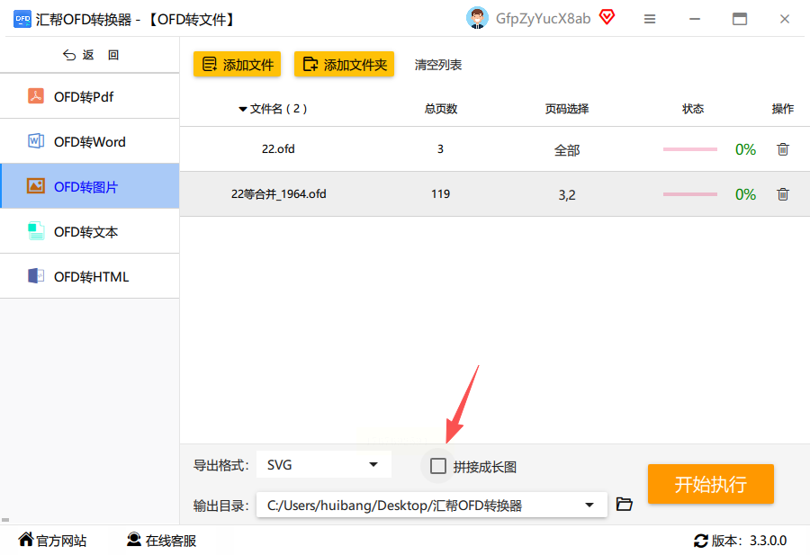在左侧操作菜单中找到"OFD转图片",然后在右侧文件区域点击"上传文件"按钮,支持单文件或批量文件上传,你可以一次性把多个OFD文件拖进来。