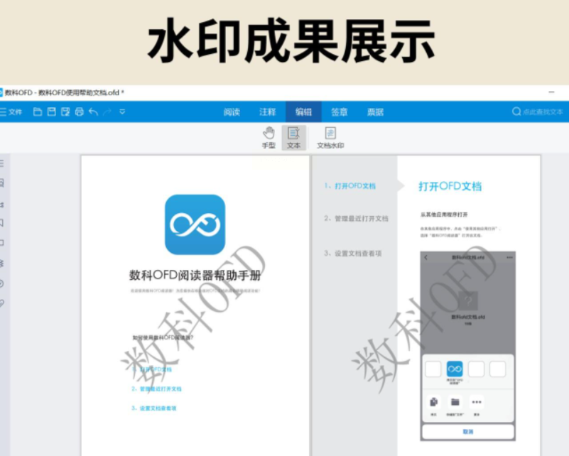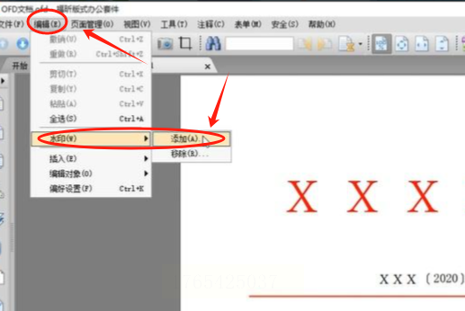 用福昕OFD打开文件后,看菜单栏。依次点击“编辑” -> “水印” -> “添加”。这个路径很清晰。